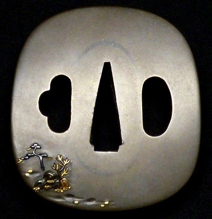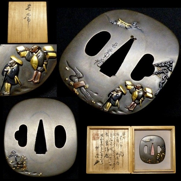 "A very stylish 'shibuichi' plate in squared circular (Okaku Maru) shape. The carved and inlaid motif is about a traveler and his vassal in route to a sanctuary. Nagatsune studied painting under Ishida Yutei. The inlay is of gold, shakudo, copper and silver. Mei: 'NAGATSUNE' H 06539.0. This mei is done in Sosho style which is rare for Nagatsune." (Haynes & Long) 5.60cm x 6.15cm x 0.30cm |