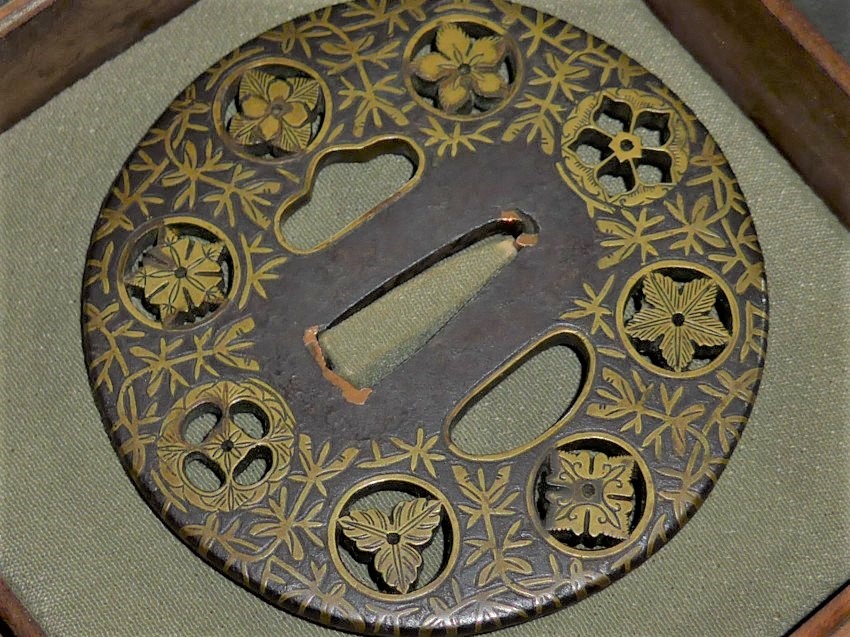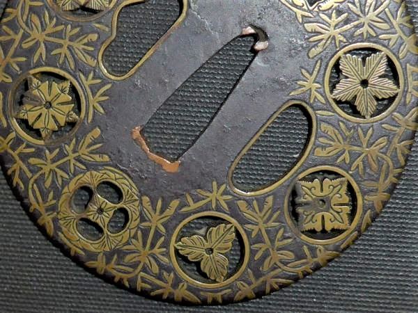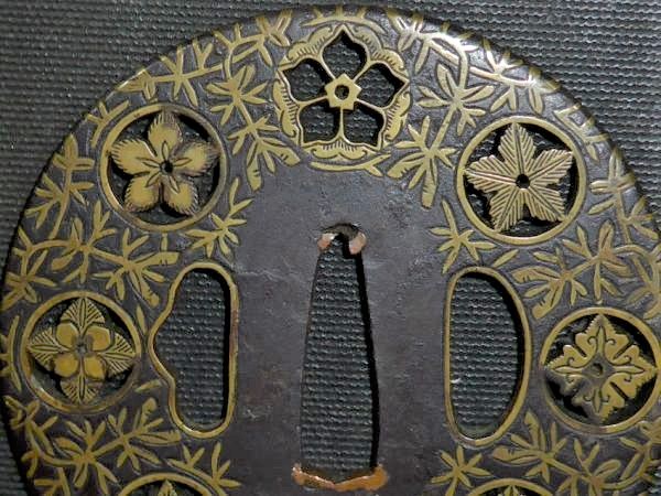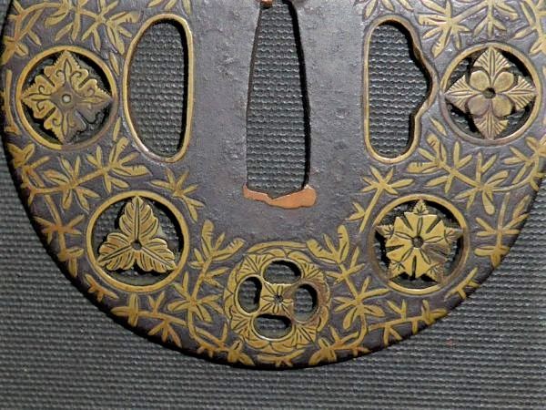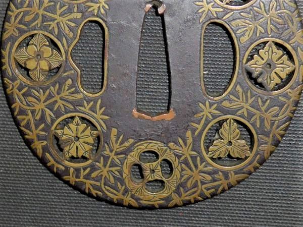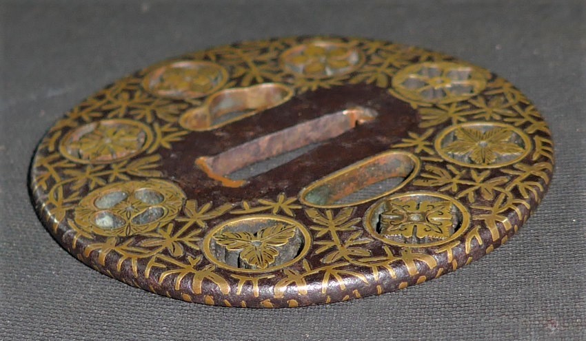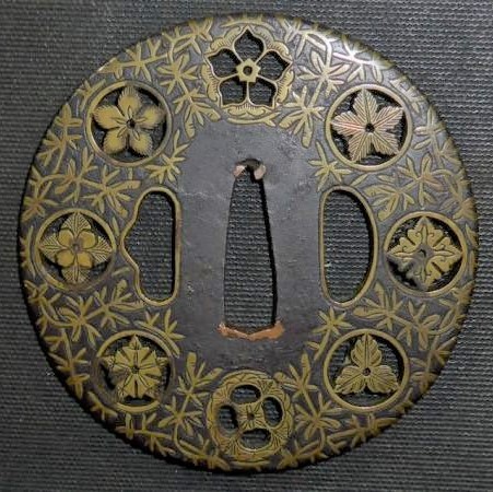 | "A maru-gata and maru mimi tsuba of well forged iron plate with eight roundels - circular emblems of flowers and/or family crests (mon) made of cast brass, pierced and chiseled in kebori, and with flat brass inlay (hira-zogan) of floral stems. This inlay style is Kaga Yoshiro zogan where the brass is inlaid into channels and then filed back to be flush with the surface of the iron plate. All inlay is present. The hitsu-ana are original and outlined in brass. There are eight different kamon in all on both sides. All kamon are in sukashi, which are obviously visible on both sides, are of various daimyo families. These sukashi sections that are inlaid into the plate are refered to as ranma-bori because they have the appearance of the ranma (transom panels with openwork carving) that are seen in Japanese temples and other important buildings above walls and doorways. Traditionally the Yoshiro school (Kaga-Yoshiro) produced tsuba decorated in silver, brass, and shakudo hira-zogan. This very fine example dates to ca. 1500." (Long) |  |