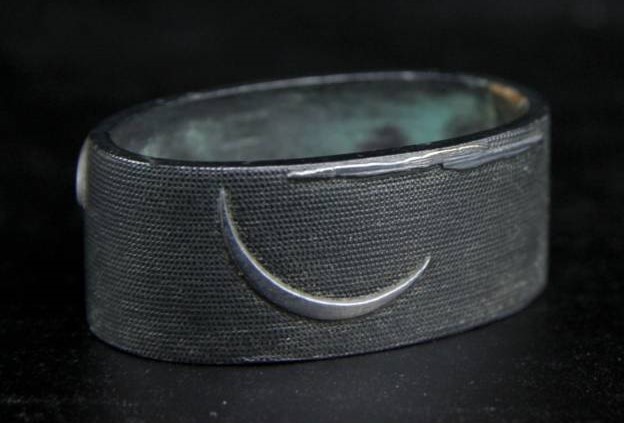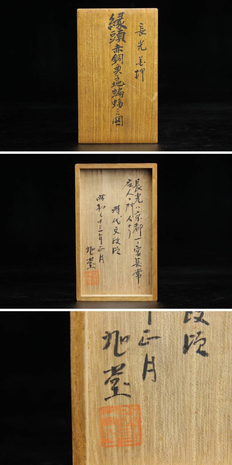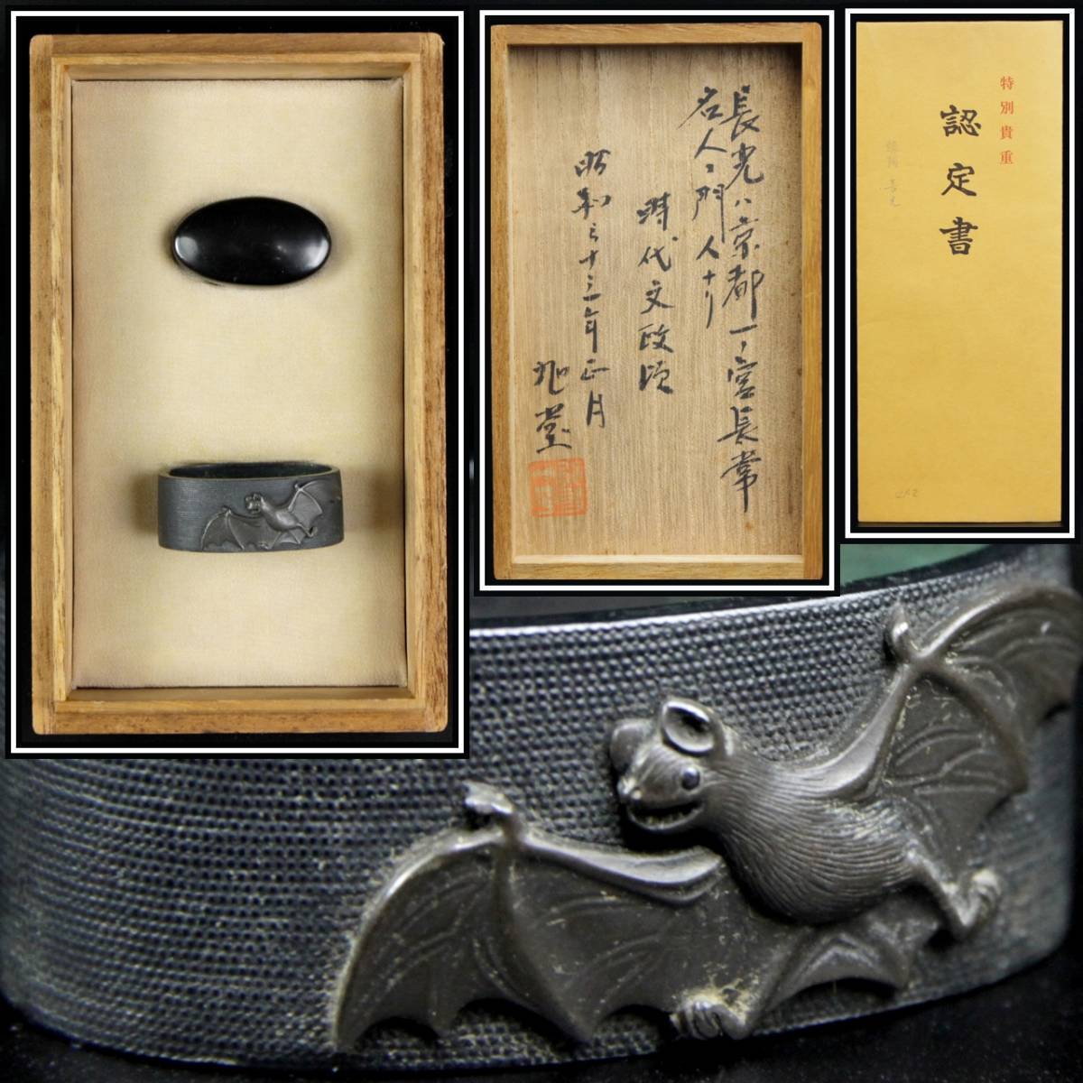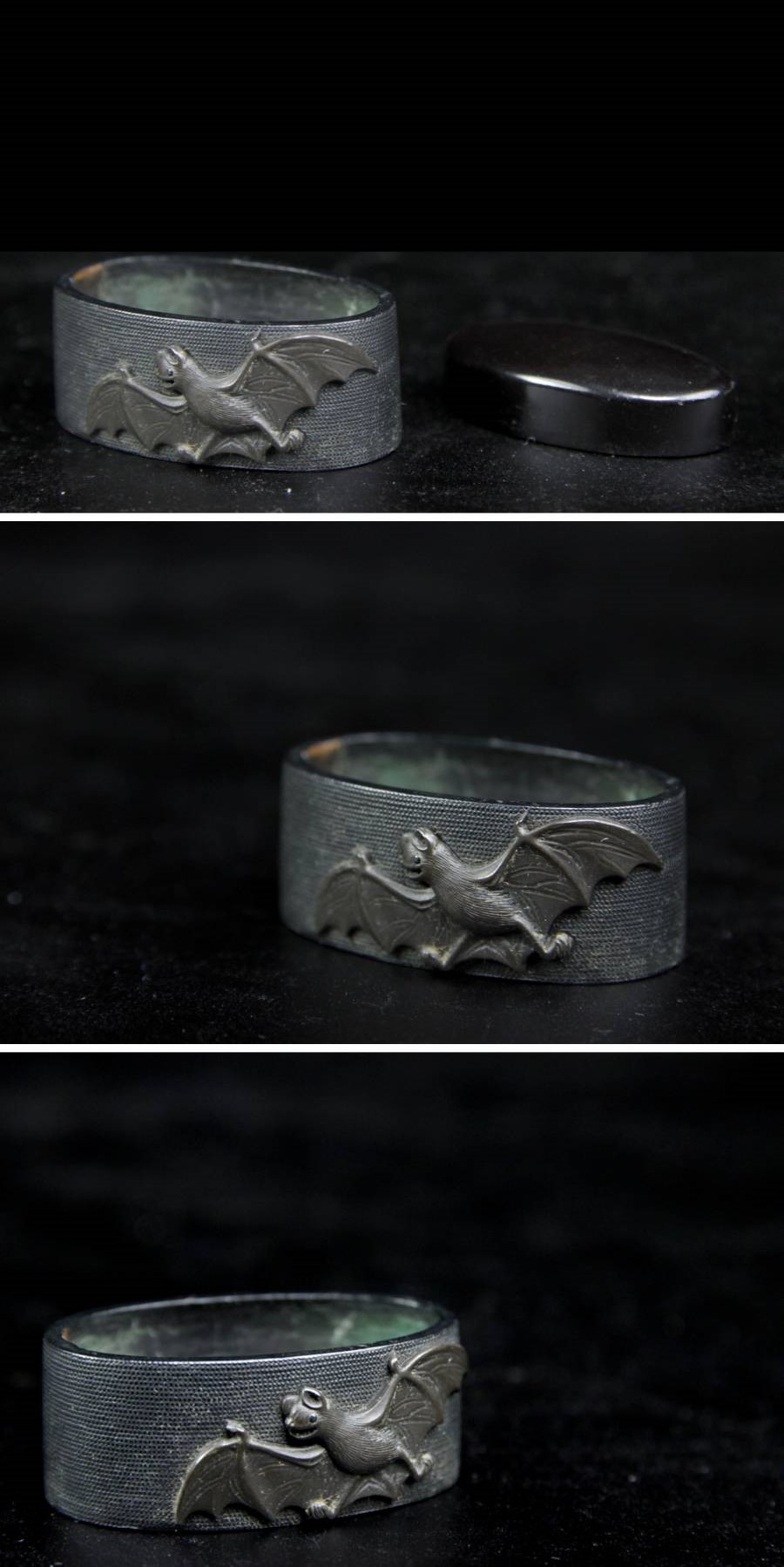 "A Crescent Moon ("Tsuki") and a Flying Bat ("Komori"). The Bat ("Komori") is the only mammal which is capable of sustained flights like a bird. They use pulse and returning echoes to recognize the image of surroundings, which enables them to hunt in the darkness of night." (Long) |