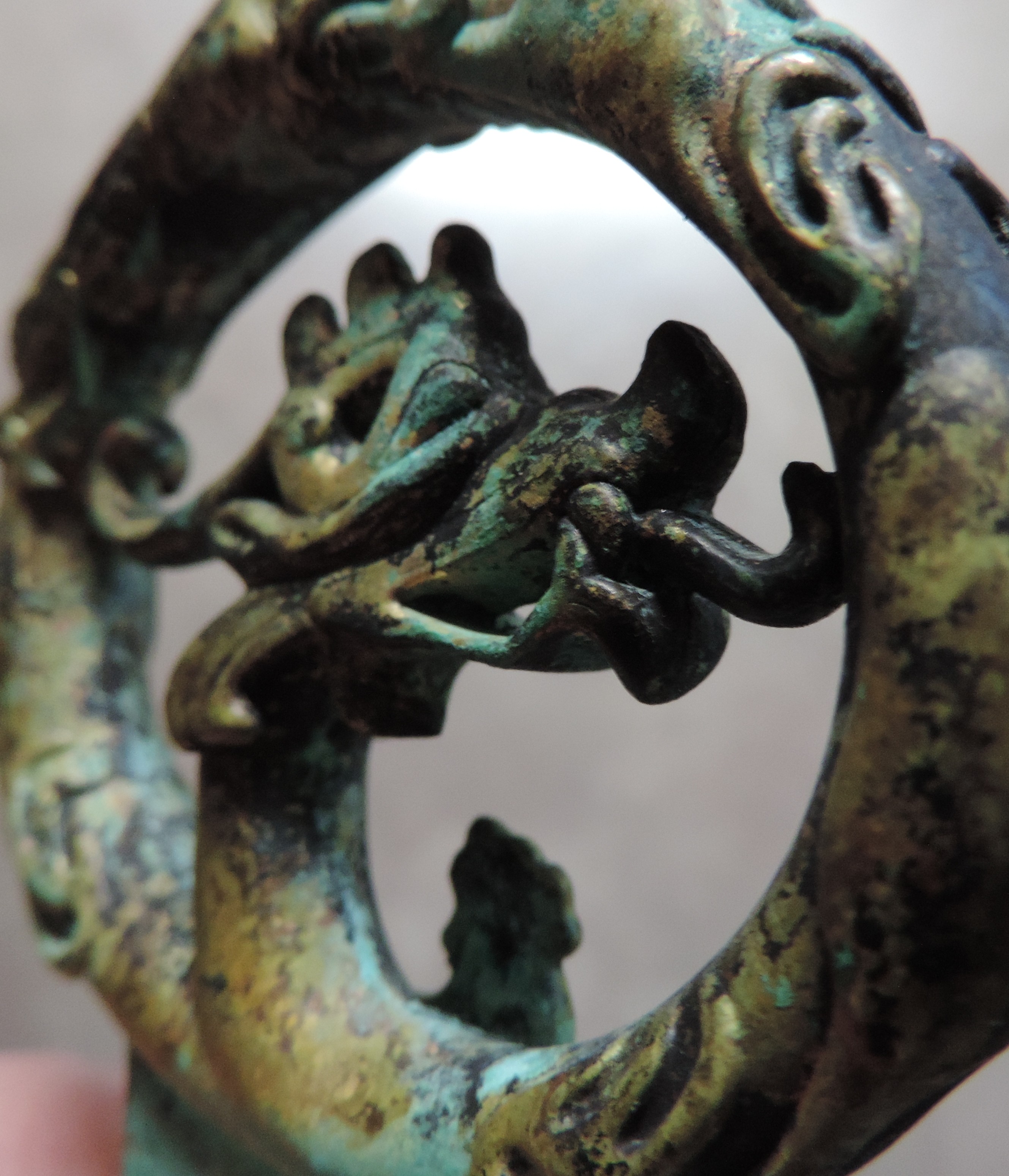 "A brass diamond shape (otafuka) tanto-sized tsuba with a well carved symetrical design of two dragons chasing a jewel. This suggests a theme of Qing Sino-Tibetan design. Dating to late Edo period. History tells us this design originated in ancient Mesopotamia, and repeated on 6th century Silk Road textiles from Central Asia. Now described as KANTON tsuba, which designates goods imported to Japan by Cantonese merchants in Nagasaki." (Long) 5.60cm x 6.15cm x 0.35cm (seppa) x 0.75cm (rim) |