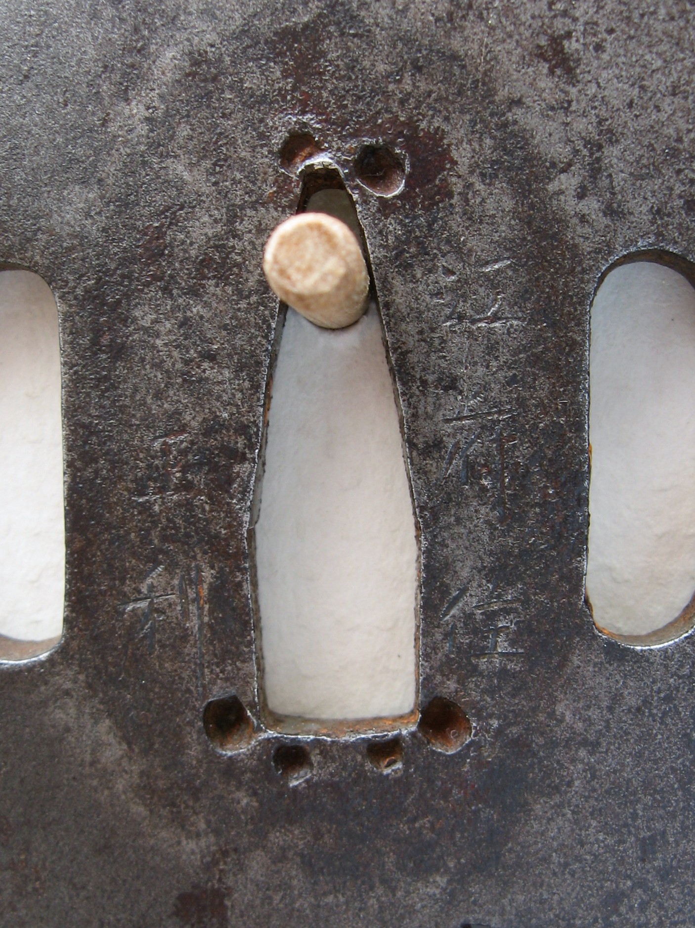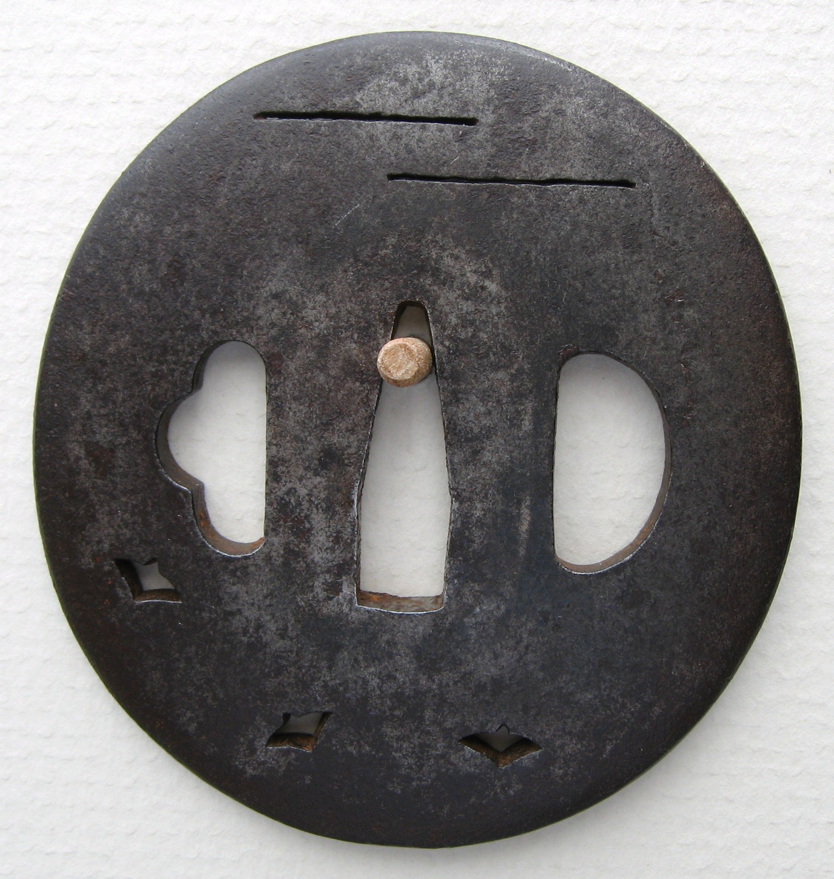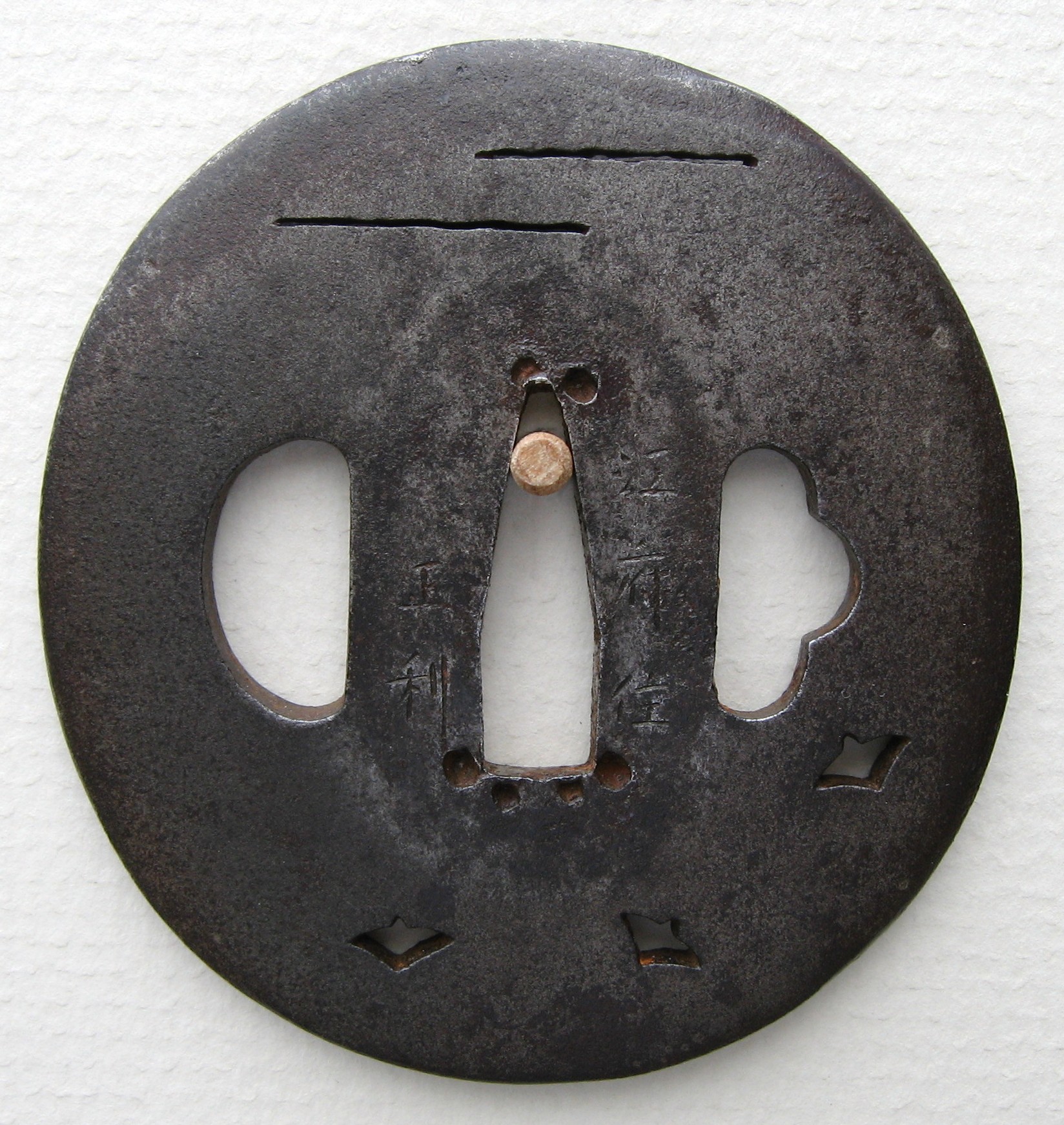 "Oval smooth iron plate that tapers slightly to the edge. With sukashi design of three chidori at the bottom and right of the plate and two 'ito' cut lines of clouds at the top of the plate. Signed: 'KOFU ju MASATOSHI', H 04584.0. He has dated a tsuba 1866. He was of the Edo Ito family school and one of its last members. This is not the Kitani artist of a generation before this man. He does not seem to be recorded by Akimoto (et all) in their 1999 book: TSUBA KO BUSHU ITO HA." (Haynes) |