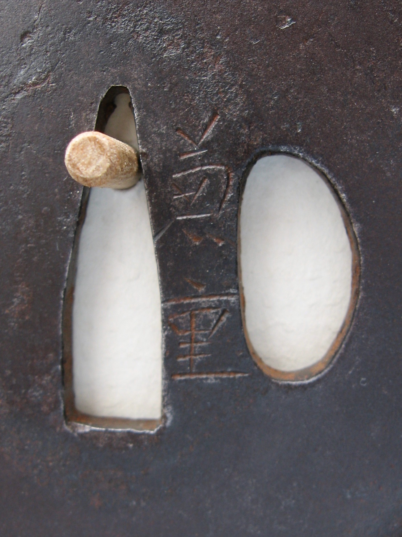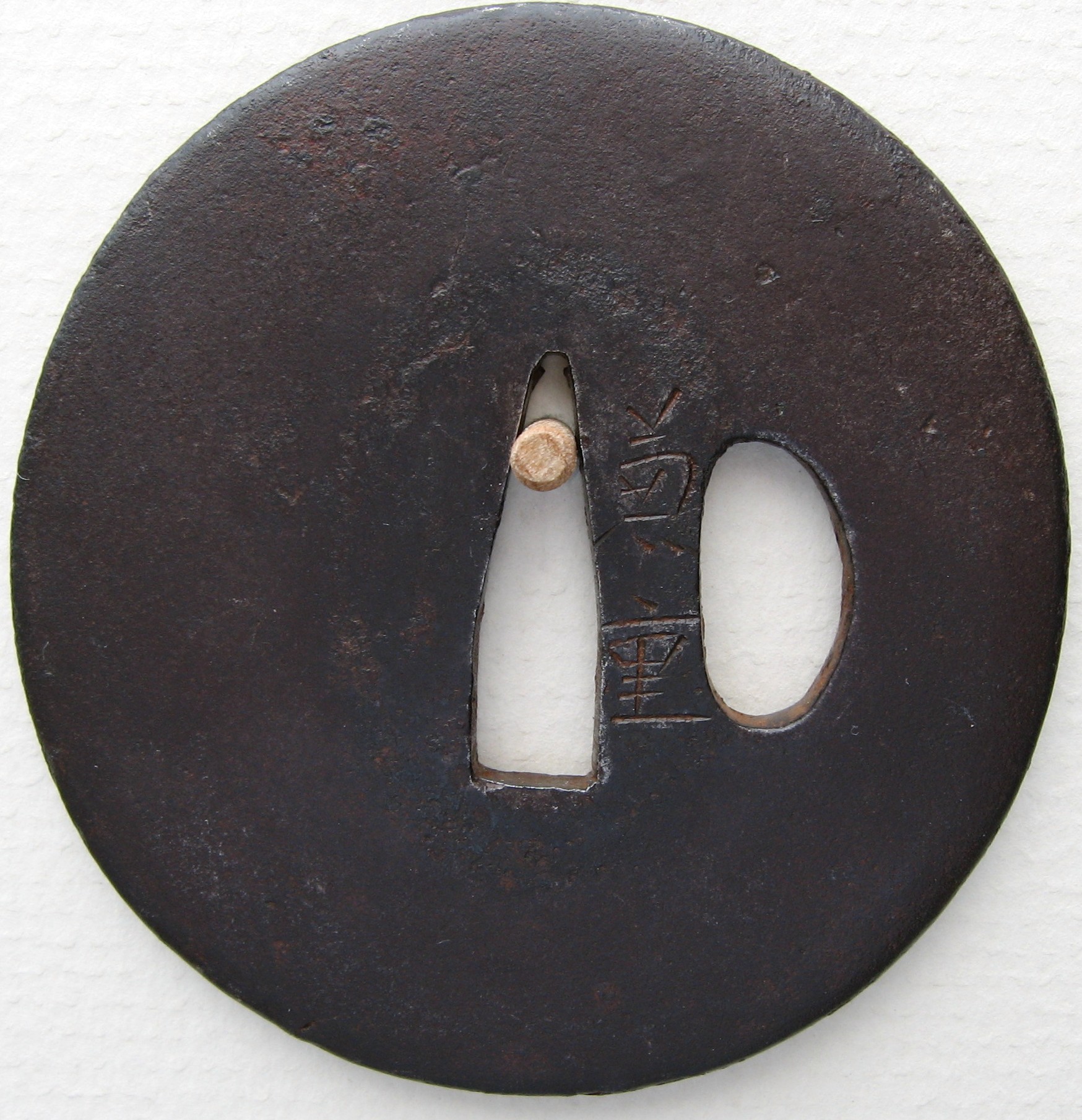 "Round iron plate with a smooth unadorned surface and one hitsu-ana. The rim and the edge show a few excellent iron bones. Signed on the reverse, right side of seppa dai: 'KANESHIGE' H 02548.A. The Kaneshige signature illustrated by Kokubo on pg. 69, of his signature book, he feels is the Hoan artist of this name, but the signature he illustrates is this artist and not the Hoan artist who used this name, and the two names look very much alike but the plate maker artist is this signature and he was to work for several schools and artists about the same period. This Kaneshige signature is rare and he seems to have signed for the plate." (Haynes) |