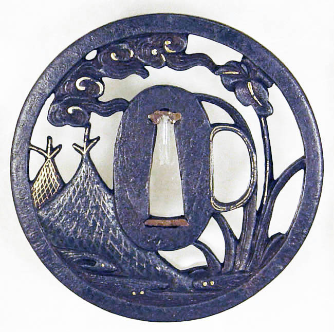 An excellent round sukashi iron tsuba, the style being rich in its decorative quality. The design of fishing nets under flowers and clouds is naive yet very tasteful. The subject of this tsuba is applicable to the countryside, having a strong and bold quality. They are decorated with gold nunome inlay. Early Edo period. 8.0cm x 8.0cm x 0.25cm |
