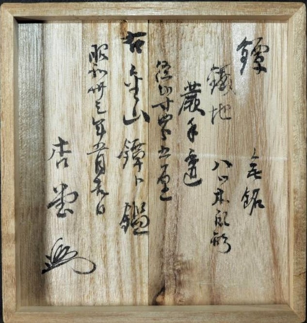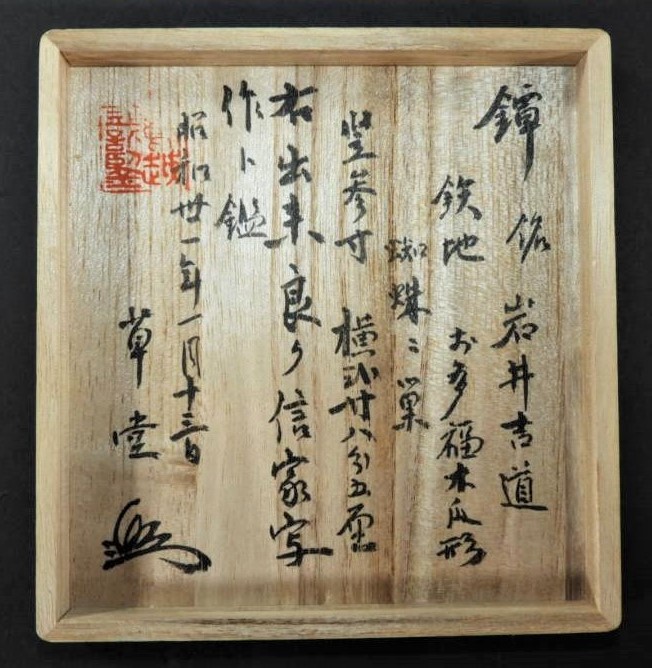 ![]() "This tsuba is contained in a box having a hako-gaki as follows: TSUBA, SIGNATURE, JOSHU JU SAOTOME IESADA, IRON PLATE, KIKU BLOOM SHAPE, MEASUREMENTS IN RIN AND BU, A TRUE WORK AS SIGNED, DATE OF SHOWA FOUR (1929), with RED SEAL AND SIGNATURE, SODO, and KAO, of a pre Edo period work. The Sodo name is very rare and seems to be one of the earliest art names used by Dr. Torigoye." (Haynes) "This tsuba was a gift to Robert Haynes from Dr. Torigoye about fifty years ago." (Long) |