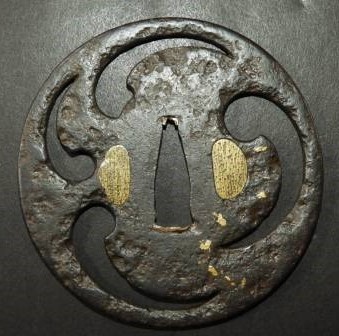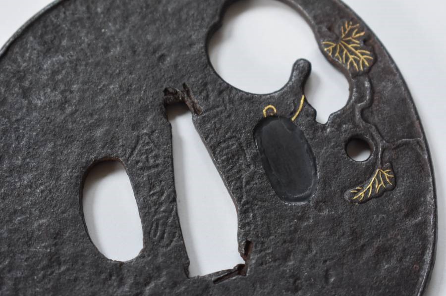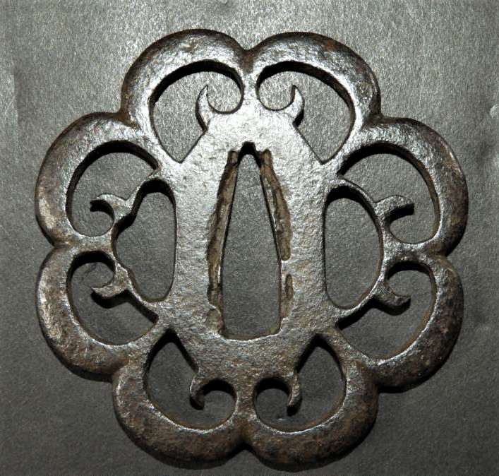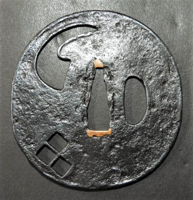 "The iron bones of the edge are strong and natural. The surface is glossy black soft steel. The smooth surface is due to the high heat used in the forging. The quality of the iron is excellent. The shape is known as yatsu mokkogata (eight lobe shape). The design as ji-sukashi, is naive in a simple naturalistic style. Dates to Momoyama period." 7.20cm x 7.10cm x 0.44cm (edge) to 0.52cm (seppa) |