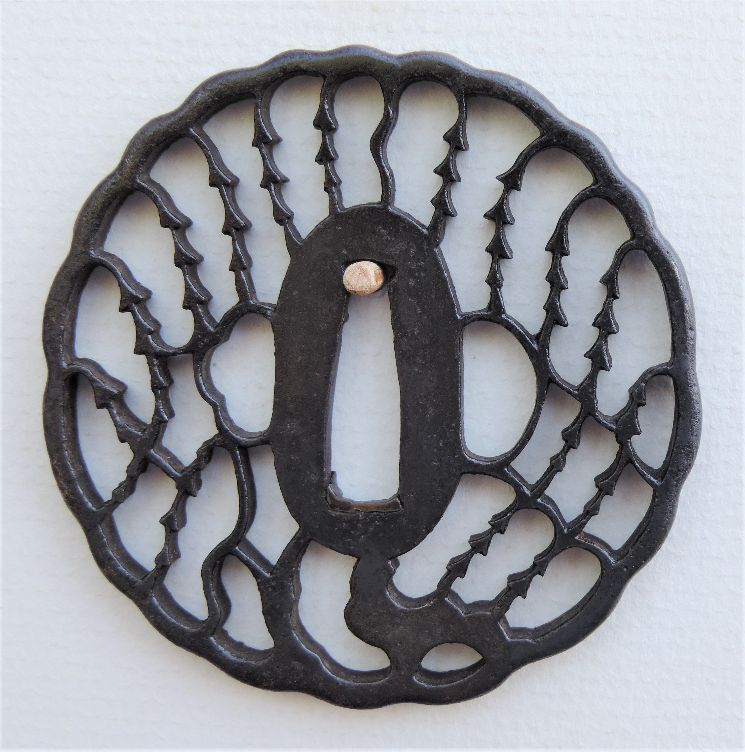 "A thin iron plate with a low relief carving of warabi-te design. Kamakura tsuba were made from Late Muromachi to Edo period. They are usually thin iron ita-tsuba with uchikaeshi-mimi and mostly large dimensioned carvings. They bear similarities to Katchushi tsuba and Onin-tsuba. All of them are unsigned so there is no information about their makers; from an overall interpretation, it seems likely that they were made by craftsmen from the Katchushi group. They were quite popular. The name “Kamakura tsuba” derives from a type of engraving called Kamakura-bori (Kamakura carving), a Chinese engraving technique originally used on lacquerware, that by Muromachi period was being applied also to tea utensils, Zen-related implements and eventually to tsuba decorations. There exist both large and small examples of Kamakura tsuba: most of them are in round shape, but there are also examples in irregular kawari-gata or lobed-shape as seen here. In most cases the iron is not high quality (even though there are exceptions), they are thin ita tsuba with large-dimensioned pattern carved out in sukidashibori, often accentuated with kebori and the carvings are not very crisp. The seppadai is in almost all cases left raised in sukinokoshi manner, so is the rest of the motif, and thus it has the same height as the patterns. The rim area is slightly thinner than the seppadai and most Kamakura tsuba show a kaku-mimi ko niku in a raised sukinokoshi interpretation. They can come with or without hitsu-ana, one being subsequently opened here. The warabi-te design is a style of ornamentation which features a curved design based on curling bracken shoots." 8.30cm x 8.24cm x 0.27cm |