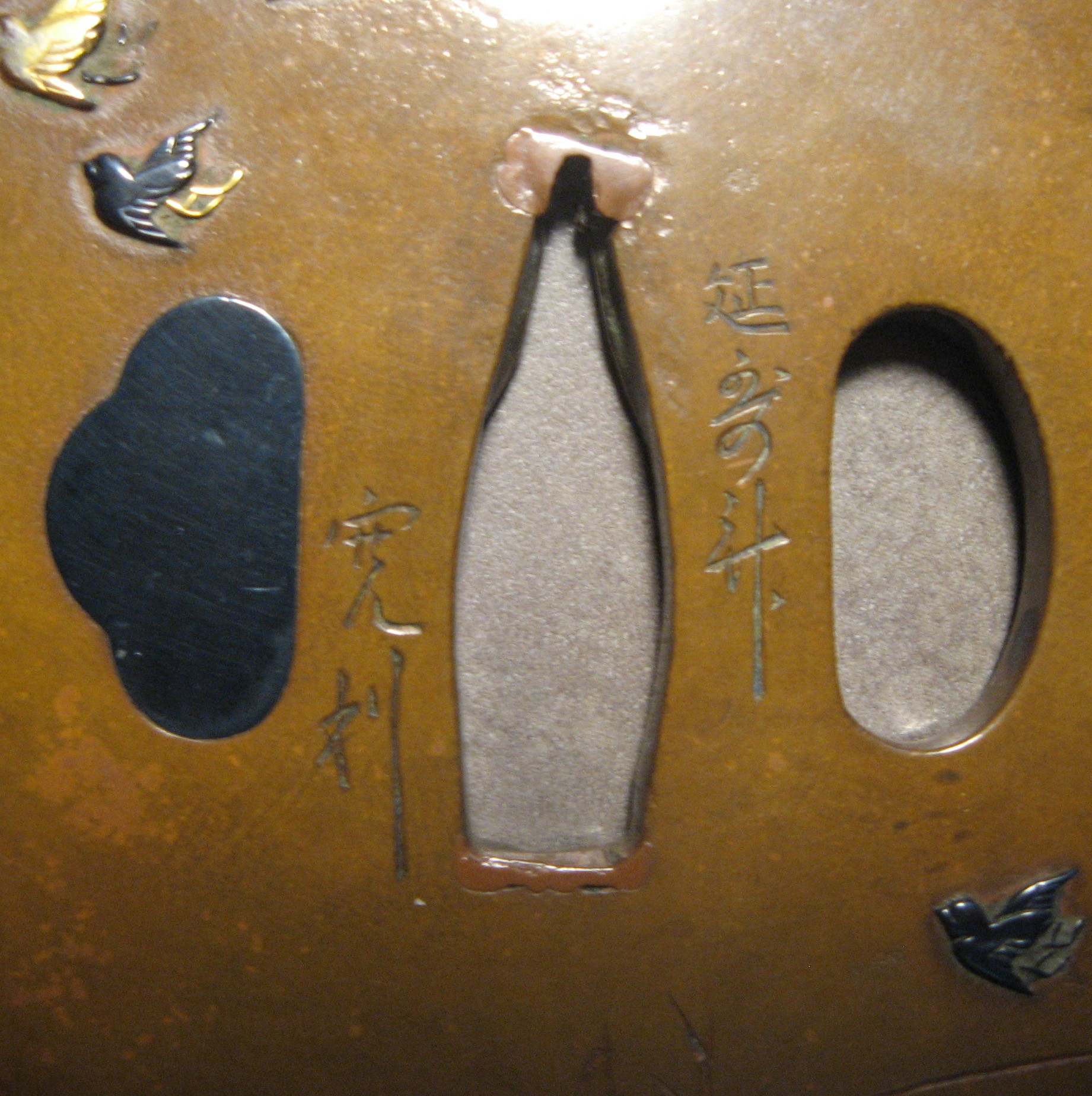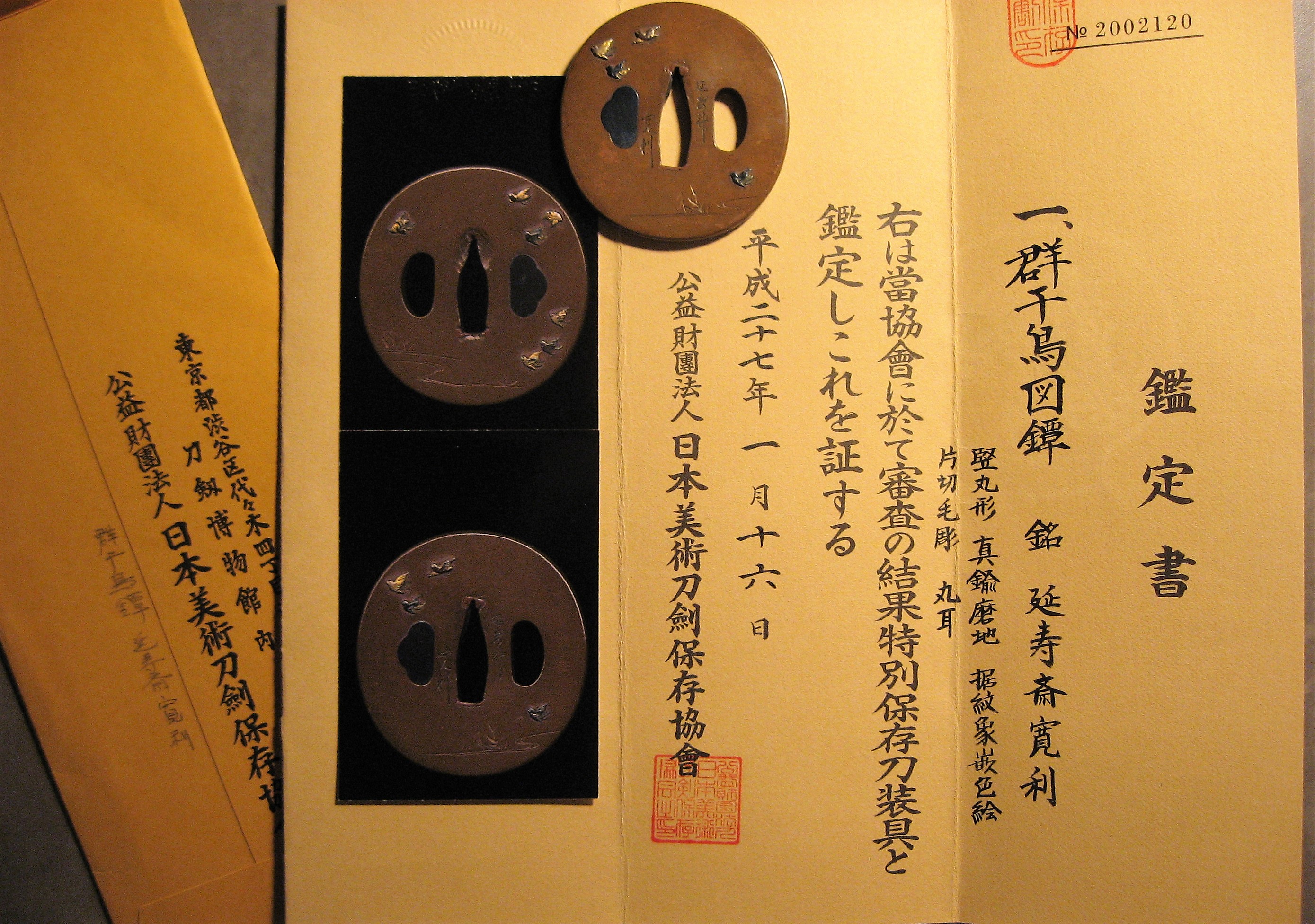 Oval copper plate with original patina in perfect condition. The design is of 'Mura-chidori', a flock of plovers. There are seven on omote and four on the ura. The flock is flying over a stream. The plovers are in gold, shakudo, and copper. See Haynes Index H 02661.0. Accompanied with NBTHK Hozon #2002120. Family of Tsuchiya Nara. Worked in Edo ca. 1725-1750. He was a student of Noda Yoshihiro, Kikan. Worked both in the style of the Nara school and that of Yoshihiro. 6.20cm x 6.60cm x 0.35cm |