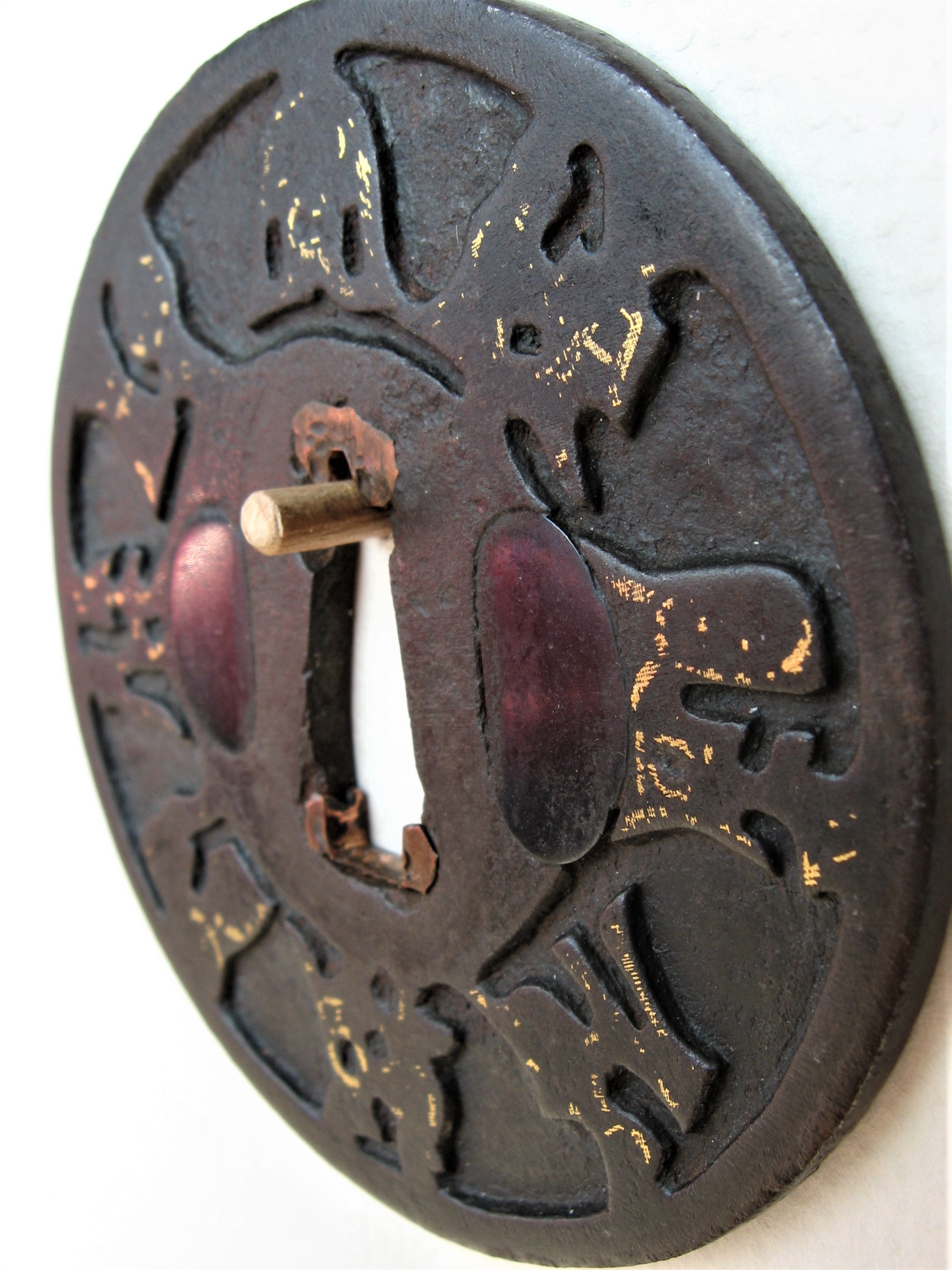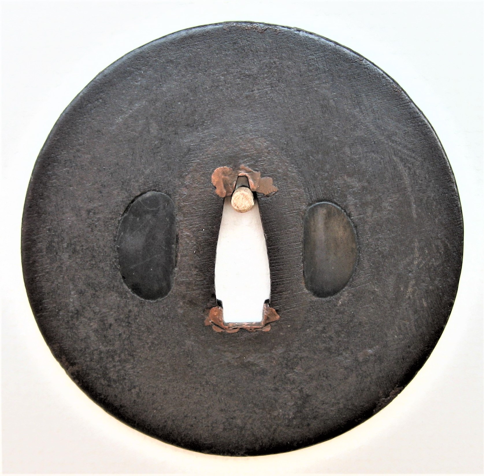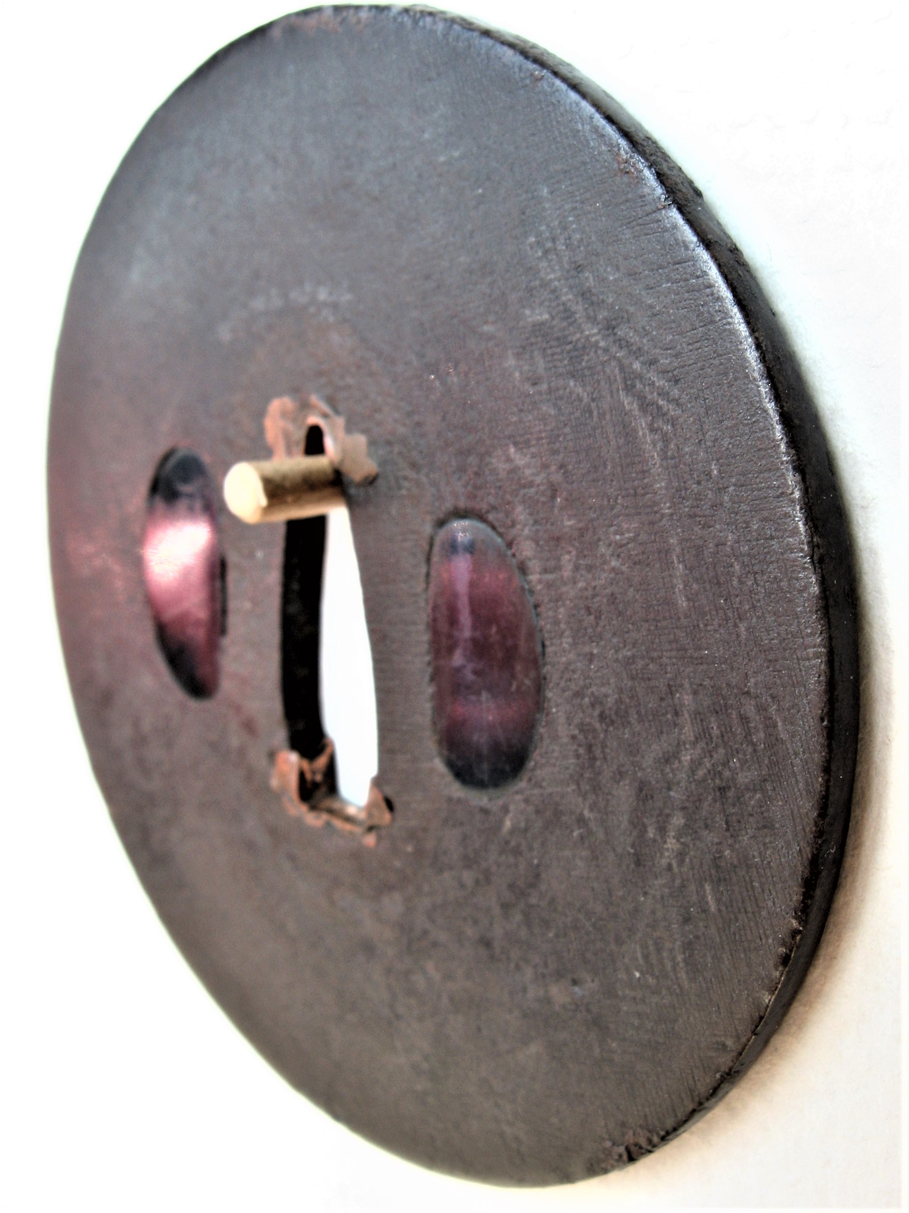 Champleve sword-guard of iron originating in Southern Asia. The technique of filling negative spaces carved into the solid plate, is known as "champleve". It seems that the negative spaces were never filled with colored vitreous enamel. The level figures left after carving the recesses are representations of seal script, an archaic form of Chinese. Usually these inscriptions are prayers or axioms of some kind. These have very fine inlay of gold. The opposite face is completely blank and smooth. This guard is not of Japanese origin but was later adapted to Japanese use. The original tang-aperture is too wide for a sword tang, and with the washer-seat being almost round, indicating that it was probably first mounted on a polearm. When it was fitted with sekigane, the hitsu-ana were added. And later yet the hitsu-ana were filled with shakudo plugs. |