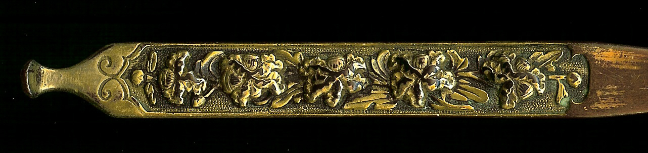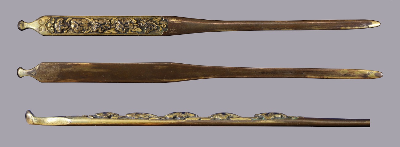 "Ezo kogai made of gold gilded yamagane, with motif of 5 peonies (botan), on a background of nanako. The motif has been carved in high relief, rather than applied to the plate. This technique is called takaniku-bori. This kogai was once fully gilded, but time-related wear has expectedly resulted in loss. In places, the remaining gold is visibly quite thick, almost a foil. The scoop or mimikaki is pronounced, as was common in some early kogai. No doubt, this was a kogai meant to be seen, and reflected the high status and wealth of its owner. Ezo kogai are very rare, and usually far less ornamental than this example. The inline floral motif was a favored subject in early Japanese metalwork, and foremost was the peony. The peony holds a honored spot in the Japanese flower symbology. It is called The King of Flowers, and is a symbol of good fortune (carried over from Chinese concepts), though in Japan, it also came to represent bravery, honor and righteous spirit. No wonder that the peony became a favorite motif of the samurai. The inline 5 peony motif first appears on early armor O-sode kanamono of the Heian / Kamakura periods (12th - 13th c). The size of those armor adornments is similar in size to the decorative plate of a robust kogai, so the motif easily transferred. The motif remained popular in either 3- or 5-inline through the Muromachi period. The robust size and boldness of this kogai, motif and generous amounts of gold application make it difficult to attribute to the mid - late Muromachi. Koshirae style tended to shorten in the 15th c., and kogai such as this, and the contemporaneous, narrow and long ko-Mino kogai simply did not fit easily into the new style. This piece would likely date to the early decades of the 15th c, when the long koshirae styles of the preceding Nanbokucho were still in favor. Tsuba with the distinctive, high peaked hitsu-ana correspond to the period of manufacture of this piece. (SEM EDS) Scanning Electron Microscopy with Energy Dispersive X-ray Spectroscopy. Based on the metallurgical tests in June of 2007, the results show gold gilded shibuichi dating to Early Muromachi Period, 15th century." (Markhasin & Long) Measurements: 23.0cm x 1.25cm x 0.48cm |