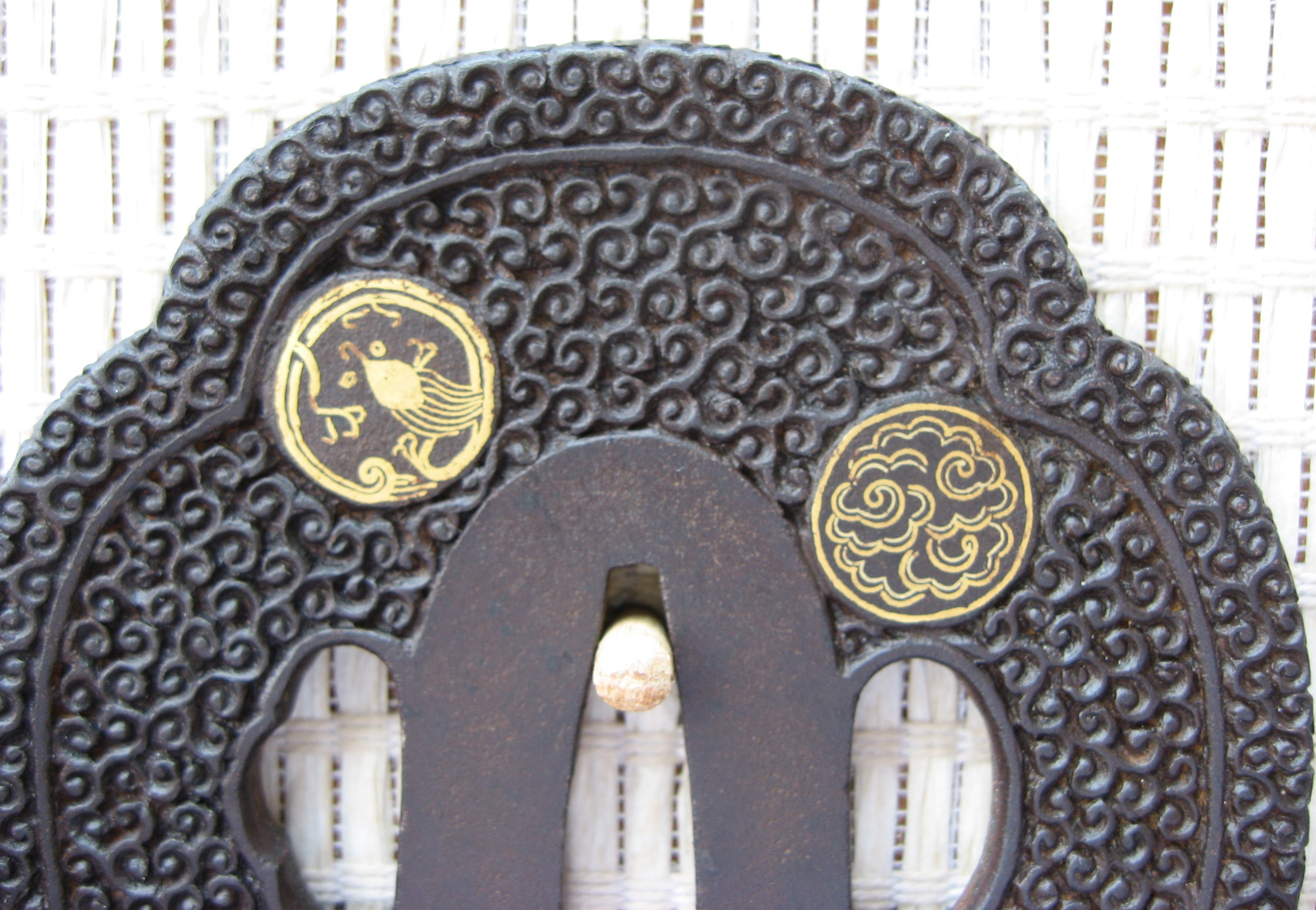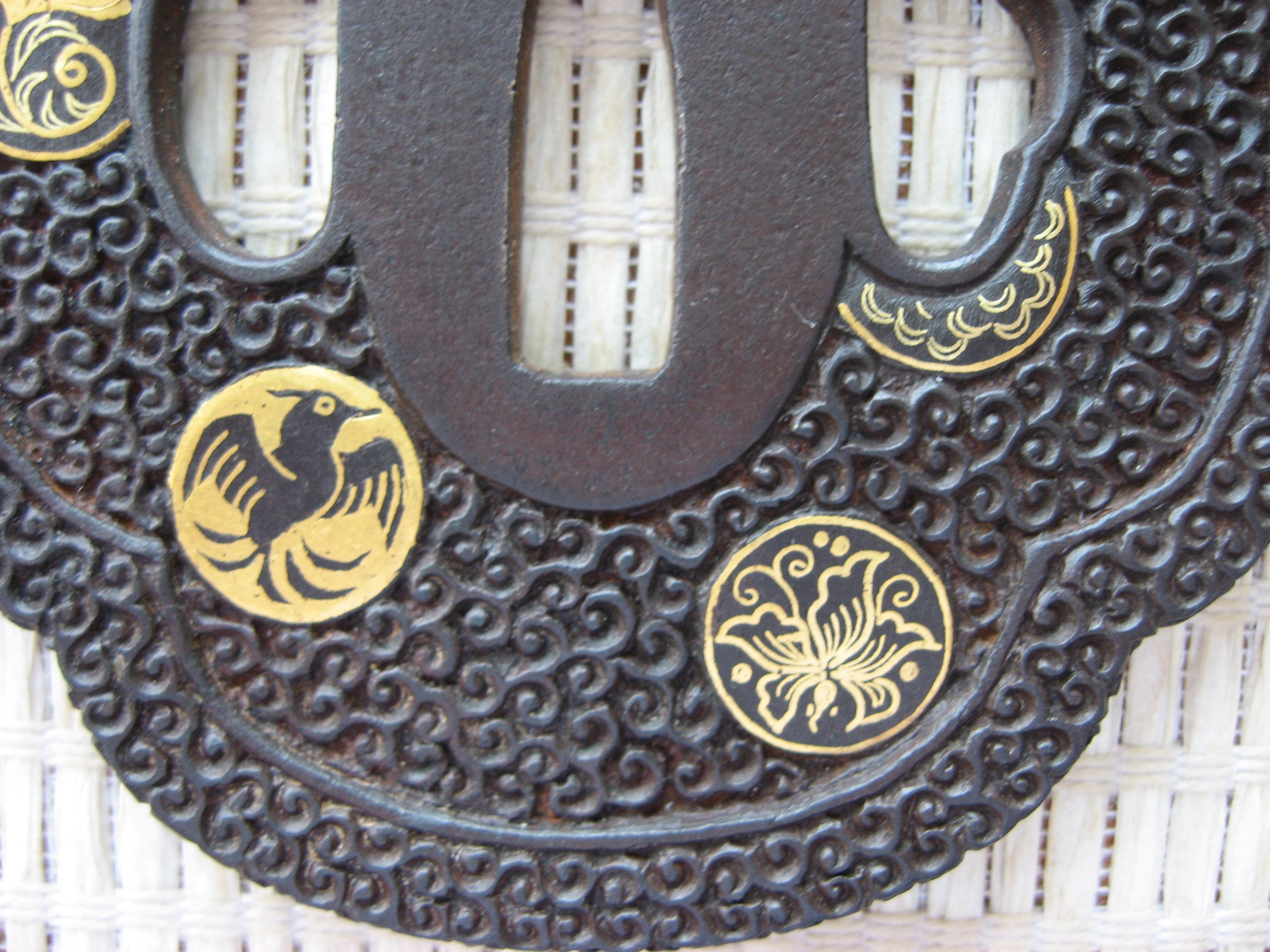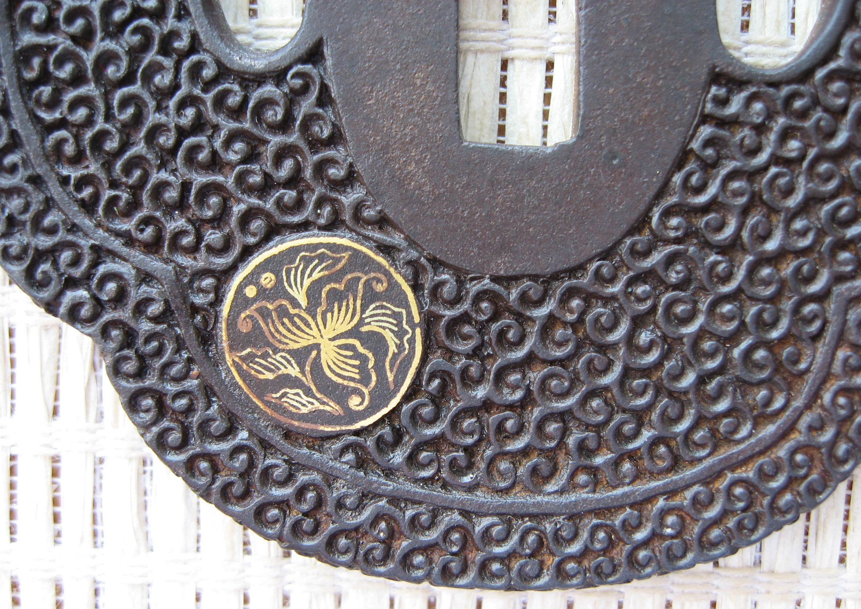 "A presentation tsuba of mokko shaped iron plate covered with fine karakusa carving on both faces and the rim. There is an internal border just inside the rim of the same mokko shape, both sides. Also appearing are seven mon on the omote and three mon on the ura." "The heraldic mon designs of clouds, falcons, chidori, bellflower and other floral designs are the emblems of early Japanese sovereigns. The roots of Japanese heraldry are alien and partrician, brought to the islands from China during the flourishing of the splendid T'ang dynasty (618-907). During these centuries, the Chinese influence extended to virtually all aspects of Japanese society and culture. The rise of heraldry among the warrior class was obviously conditioned by the harsher, disparate features of medieval Japan. According to some accounts, the first significant impetus to the use of heraldic markings by the warrior class derived from Yoritomo (1148-1199). What heraldry eventually became in Japan was a system of kamon, or family crests; that is, the use of a distinctive mark as symbol of one's family name." (Long) |