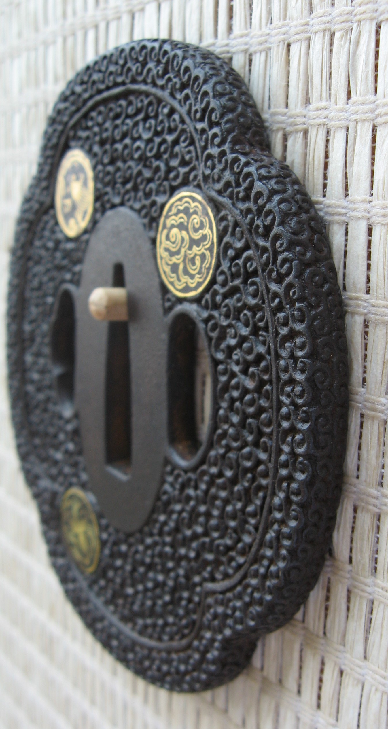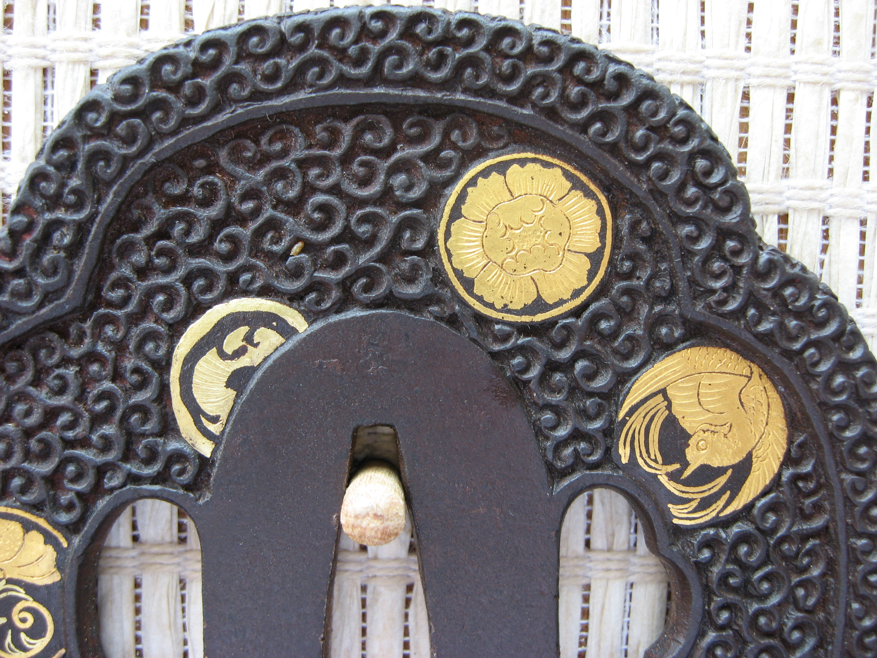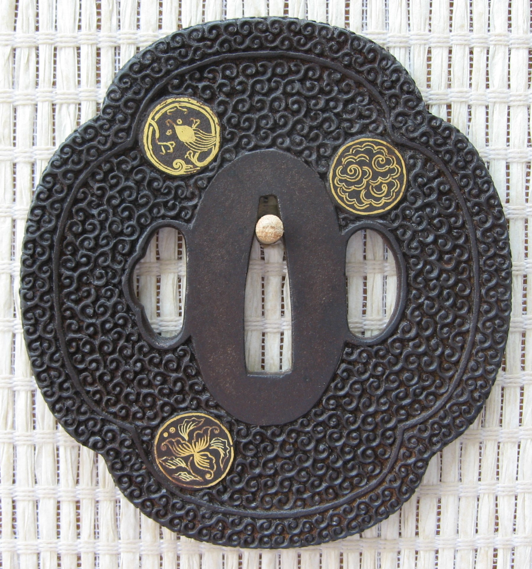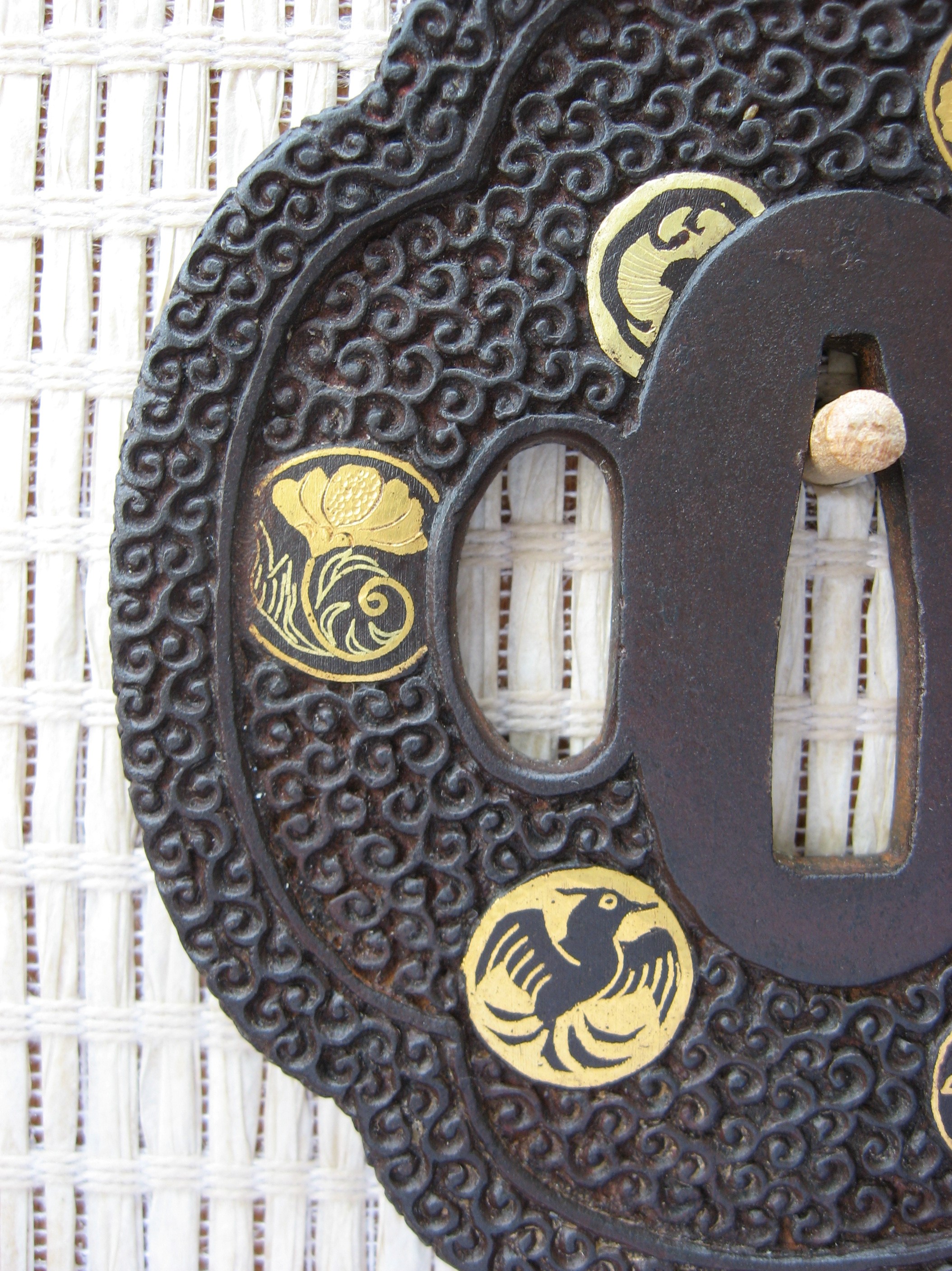 "A presentation tsuba of mokko shaped iron plate covered with fine karakusa carving on both faces and the rim. There is an internal border just inside the rim of the same mokko shape, both sides. Also appearing are seven mon on the omote and three mon on the ura." "The heraldic mon designs of clouds, falcons, chidori, bellflower and other floral designs are the emblems of early Japanese sovereigns. The roots of Japanese heraldry are alien and partrician, brought to the islands from China during the flourishing of the splendid T'ang dynasty (618-907). During these centuries, the Chinese influence extended to virtually all aspects of Japanese society and culture. The rise of heraldry among the warrior class was obviously conditioned by the harsher, disparate features of medieval Japan. According to some accounts, the first significant impetus to the use of heraldic markings by the warrior class derived from Yoritomo (1148-1199). What heraldry eventually became in Japan was a system of kamon, or family crests; that is, the use of a distinctive mark as symbol of one's family name." (Long) |