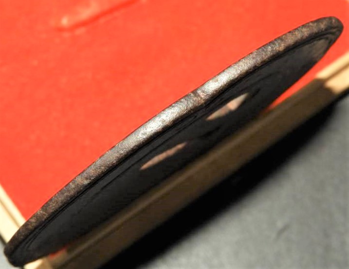 "A thin iron plate with a low relief carving of warabi-te design. Kamakura tsuba were made from Late Muromachi to Edo period. They are usually thin iron ita-tsuba with uchikaeshi-mimi and mostly large dimensioned carvings. They bear similarities to Katchushi tsuba and Onin-tsuba. All of them are unsigned so there is no information about their makers; from an overall interpretation, it seems likely that they were made by craftsmen from the Katchushi group. They were quite popular. The name “Kamakura tsuba” derives from a type of engraving called Kamakura-bori (Kamakura carving), a Chinese engraving technique originally used on lacquerware, that by Muromachi period was being applied also to tea utensils, Zen-related implements and eventually to tsuba decorations. There exist both large and small examples of Kamakura tsuba: most of them are in round shape, but there are also examples in irregular kawari-gata or lobed-shape as seen here. In most cases the iron is not high quality (even though there are exceptions), they are thin ita tsuba with large-dimensioned pattern carved out in sukidashibori, often accentuated with kebori and the carvings are not very crisp. The seppadai is in almost all cases left raised in sukinokoshi manner, so is the rest of the motif, and thus it has the same height as the patterns. The rim area is slightly thinner than the seppadai and most Kamakura tsuba show a kaku-mimi ko niku in a raised sukinokoshi interpretation. They can come with or without hitsu-ana, one being subsequently opened here. The warabi-te design is a style of ornamentation which features a curved design based on curling bracken shoots." |