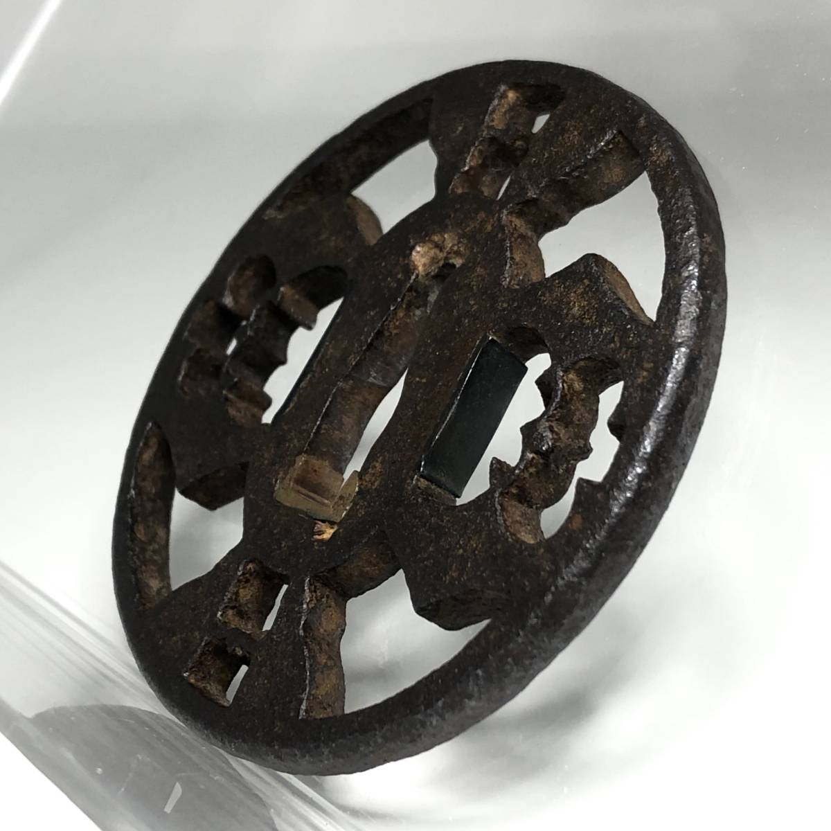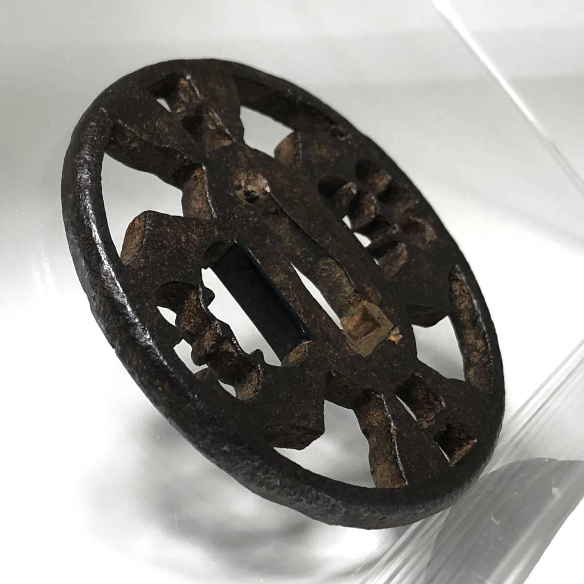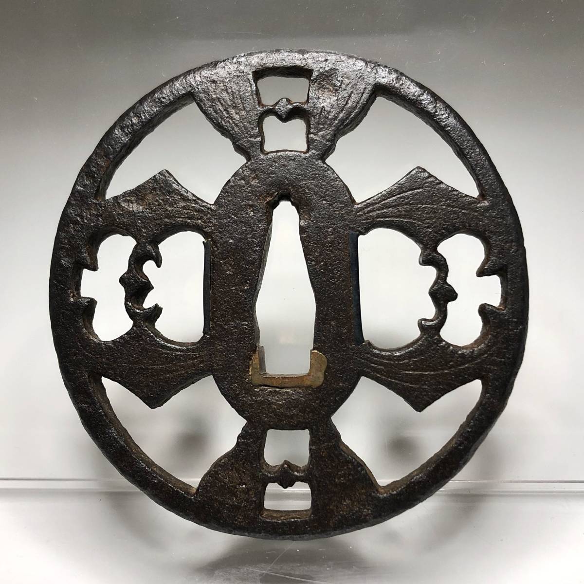 "A small compact Kanayama tsuba of very dense quality iron showing pronounced tekkotsu or iron bones. Tekkotsu are areas of steel that are harder due to greater carbon content than the surrounding metal. The metal has a bright gleam, and the rim is somewhat thin. The deep color of the iron, the look of age of the metal surfaces indicate that this is a work from the middle Muromachi period. The design is representational of four double Ginger leaves (Shiho-dakimyoga), which symbolizes divine protection. More precisely, two opposed ginger leaves represent a request for protection from the gods of the native Japanese Shinto and the deities of Buddhism." (Long) |