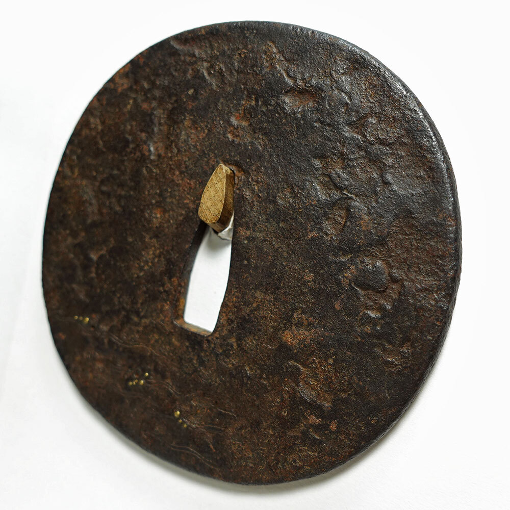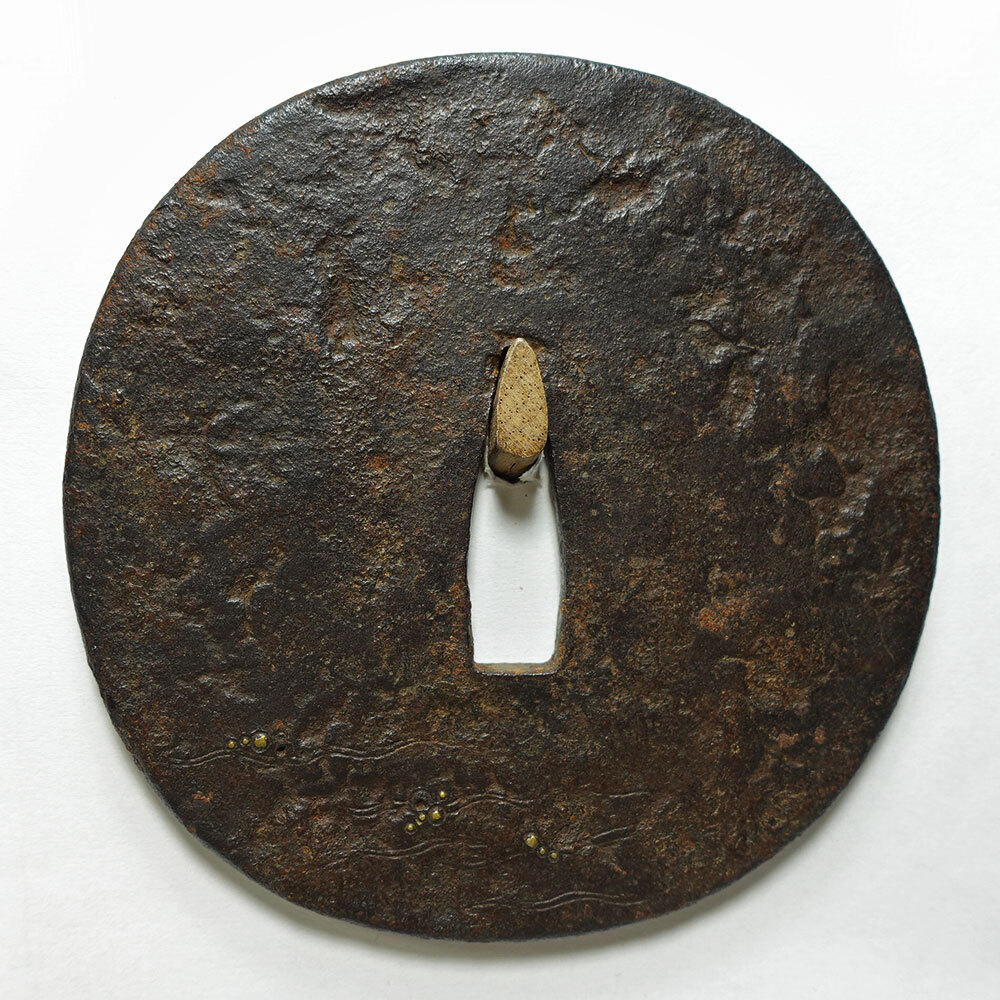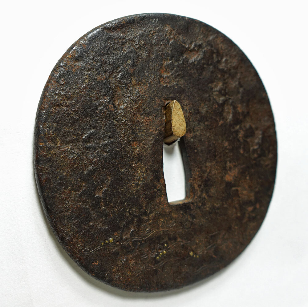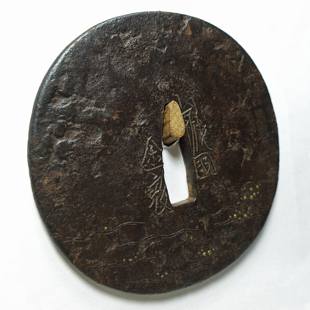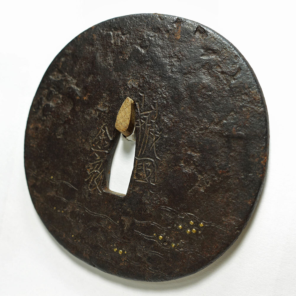 "This is a tsuba with a hammered iron surface with a wave pattern, inscribed "Kaneiye, Yamashiro Province", with hair engraving, ubu, brass dot inlay, small square rim. It is an old tsuba with a stately style. The exact era is unknown, but it is thought to be quite old, dating ca.1500 or earlier. The inscription is by Kaneiye, a master craftsman on par with Nobuie. The tone is very high quality and the condition is good. There is minimal missing inlay." (Long) 8.08cm x 8.03cm x 0.34-40cm |