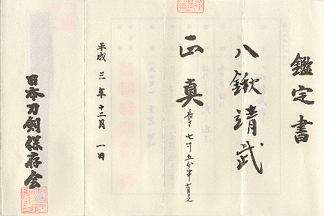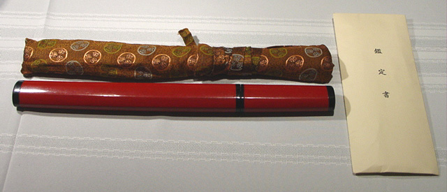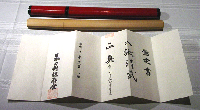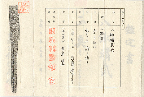 Yakuwa Yasutake (1909 - 1984) was born in Yamagata. Teachers were Yasumitsu and Yasushige. He joined the NTK (Nihonto Tanren Kai) as a hPapyrusman in Showa 10 (1935), became a sakite for Yasumitsu and Yasushige in Showa 14 (1939) and came to be a Yasukuni tosho in Showa 19 (1944). After the WWII, he began swordmaking again in Showa 29 (1954) and became a Mukansa in 1981. He won a lot of awards and prizes during his life and regarded as the best smith among other postwar Yasukuni tosho. This O-kogatana is longer than usual tanto. It has a nagasa of 23cm and total lenght is 33.7cm. Blade is in excellent condition and papered from the NTHK in 1991 with 6 stamps including Yoshikawa Sensei. It accompanies gold foiled habaki and two gorgeous saya; One is red lacquered and the other is shirasaya.