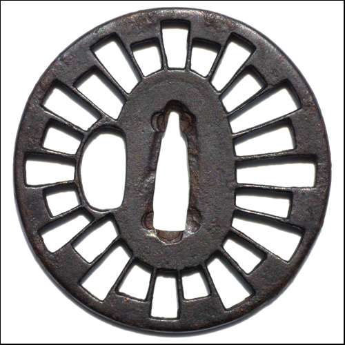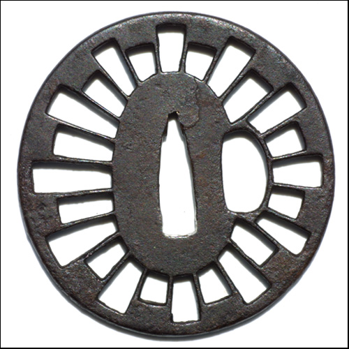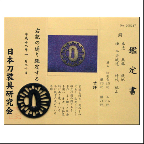 Shoami Tsuba of Genji Guruma Design.Genji Guruma is straight sided Sukashi in the pattern of a wheel.Momoyama to early Edo period.Origami by Nihon Tosogu Kenkyukai.Excellant Tetsu-Ji Tsuba. Maru-gata shape.7.3cm x 7.1cm x 0.4cm.