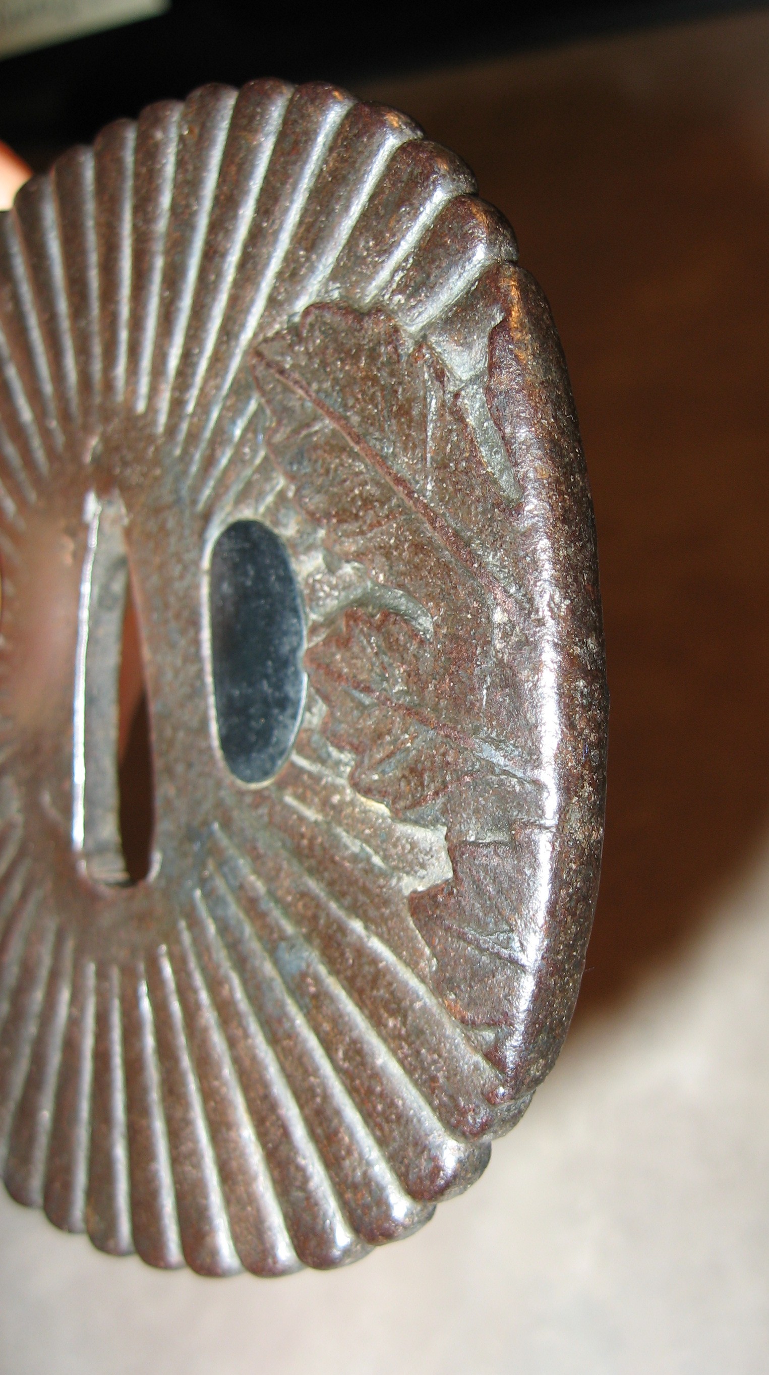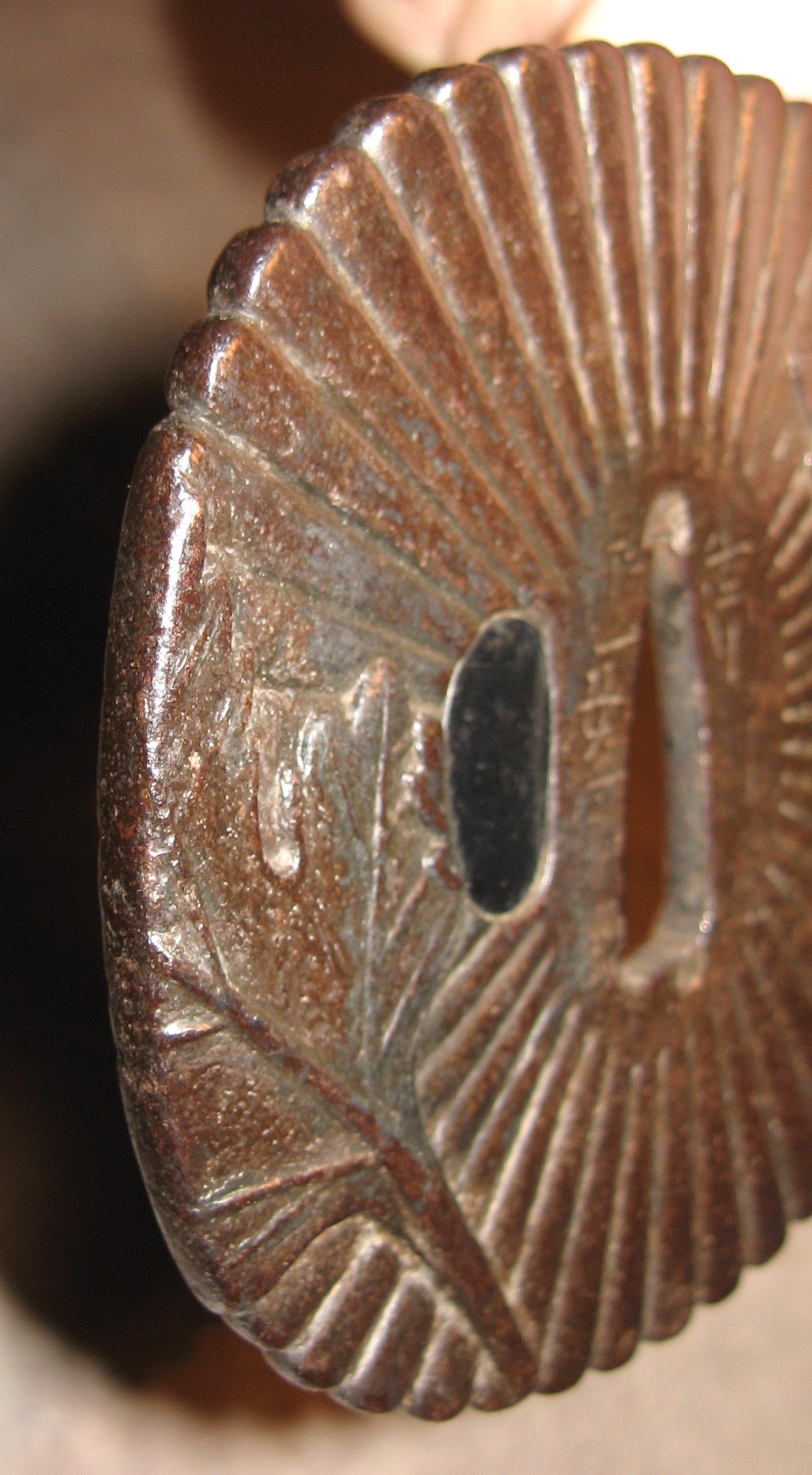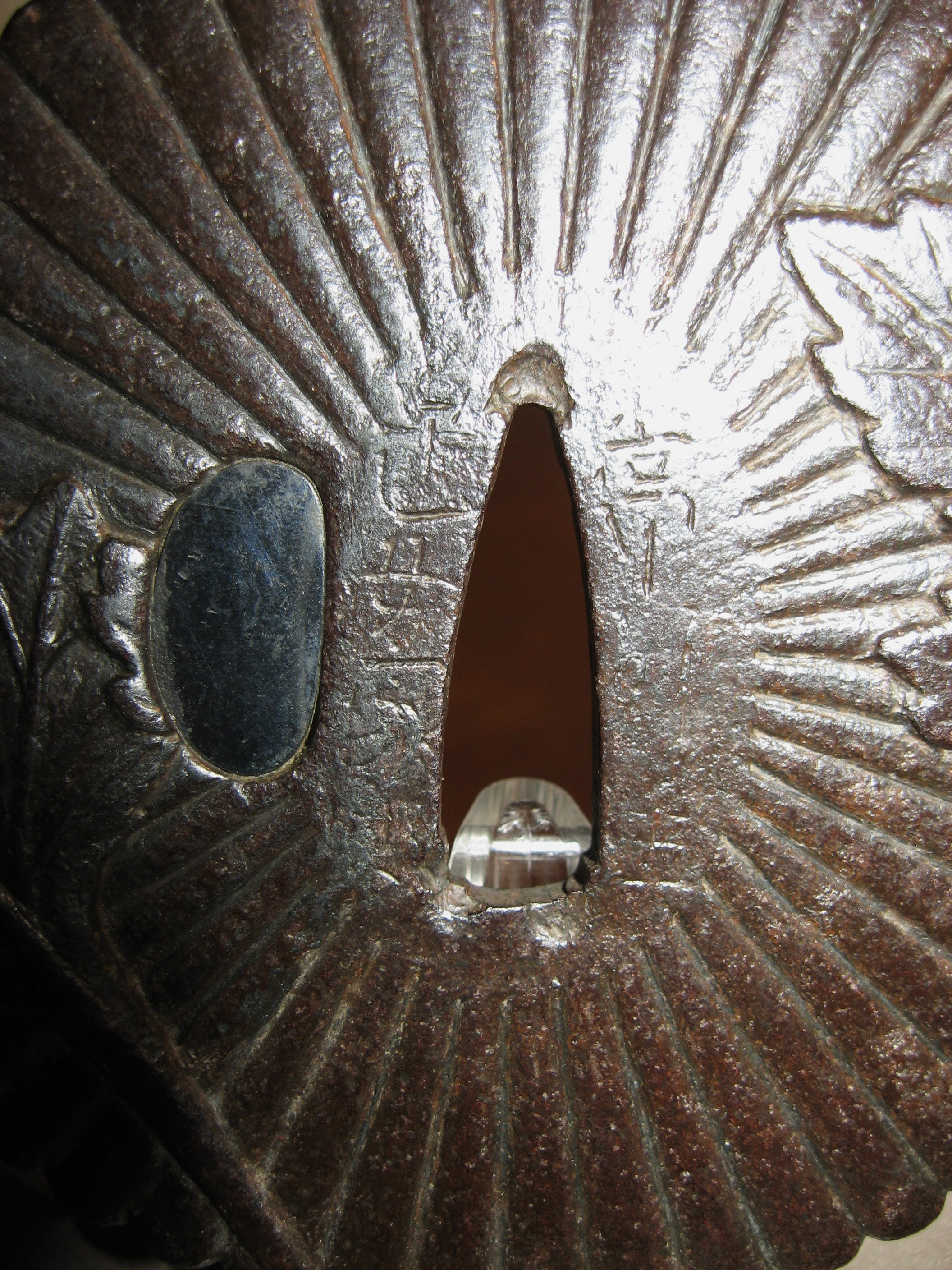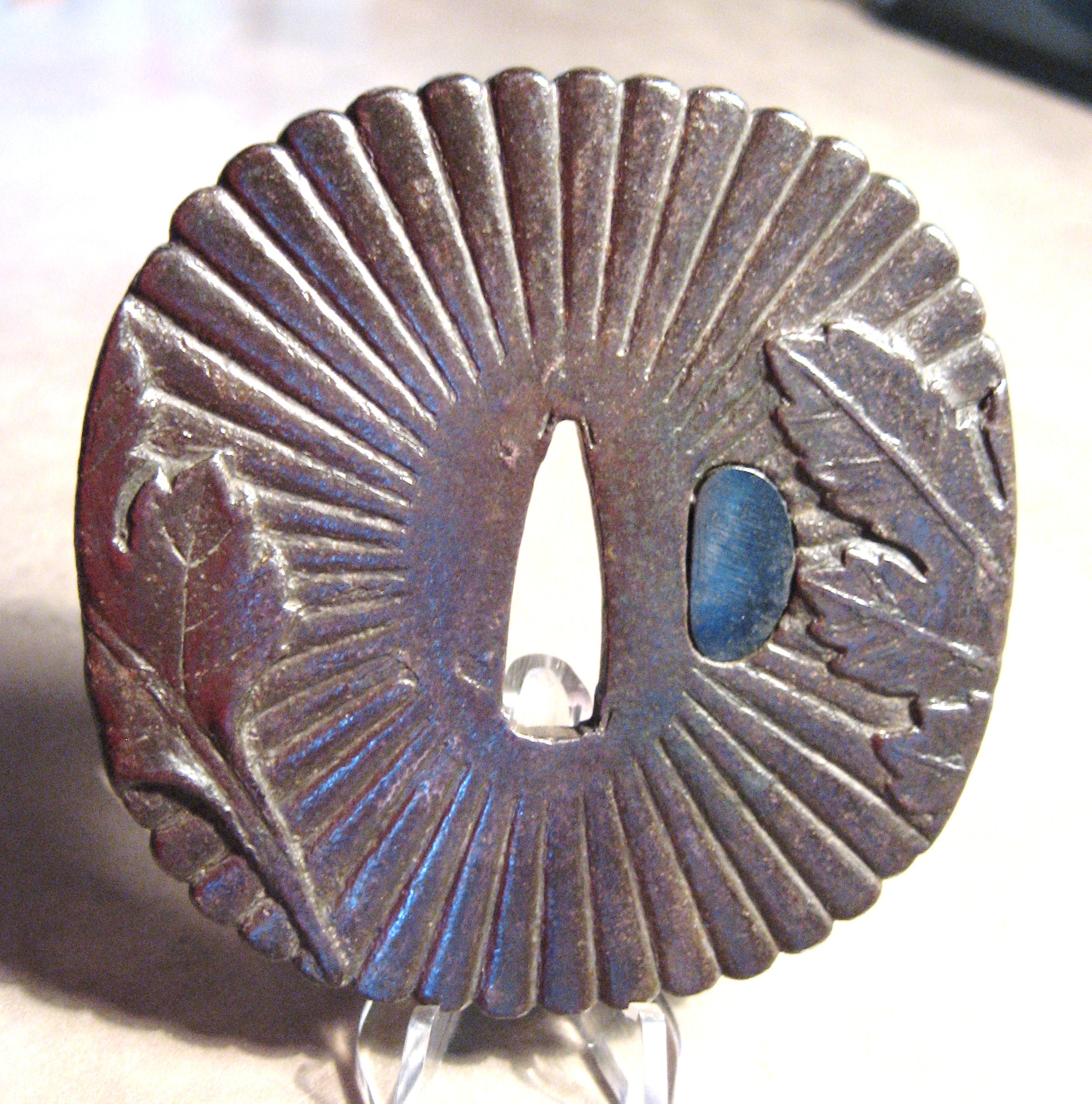 H 01803.0 "Iron plate of a deep purple black color of great richness. The oval plate formed as 42 petals of a chrysanthemum bloom, with a leaf of the plant folded over the left and right sides. The right leaf showing the face and the left leaf showing the backside. Of katana size (see below). It is interesting to note that this tsuba is very "heavy" and dense when compared to others of its size and form. It may contain meteoric iron. It is signed on the face: 'JOSHU JU' (Hitachi Province) on the right side of the seppa-dai, and 'SAOTOME IESADA' on the left side. The kozuka ana is filled with a shakudo plug." (Haynes) |