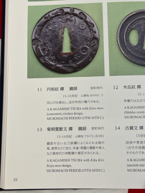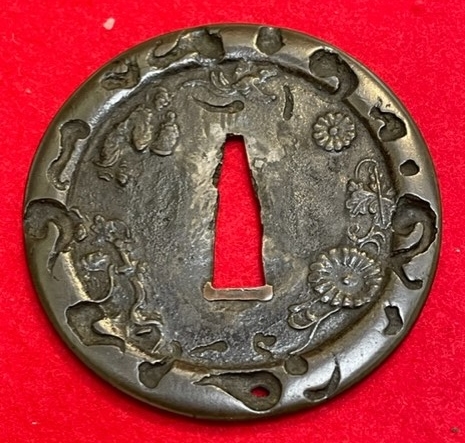 "A typical middle size Kagemishi tsuba. It is a cast work and has the usual design elements of its style and period, ca.1400. The hitsu-ana, probably added later, have now been filled and are hard to see, much in the works favor. See KoKubo book for a very similar example. 7.32cm x 7.19cm x 0.27cm |