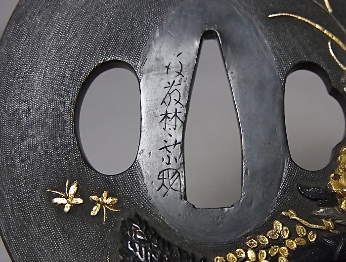 | "A shakudo plate with the finest and most delicate nanako surface. This decoration appears on both faces and the rim. The size of the dots and the regularity of the work is marvelous as the dots must be placed entirely by touch. On the omote we find peonies and butterflies along with other foliage inlaid with gold and shakudo. On the ura are more butterflies and chrysanthemums inlaid with gold and shakudo. The mei reads: GOTO RINJO with Kao. (H 07553.0) This is the only known and rare example of his signature. He is considered the founder of the Goto Hanzaemon family line and the third son of Goto Kyujo (H 03741.0)." (Long) |