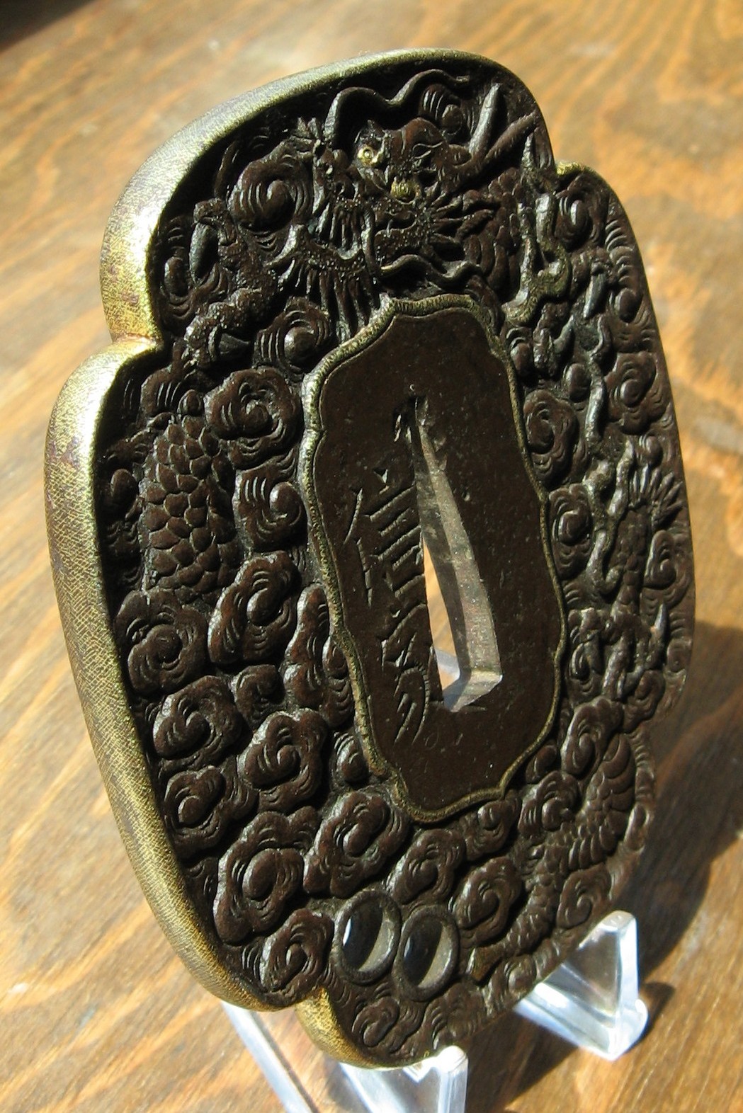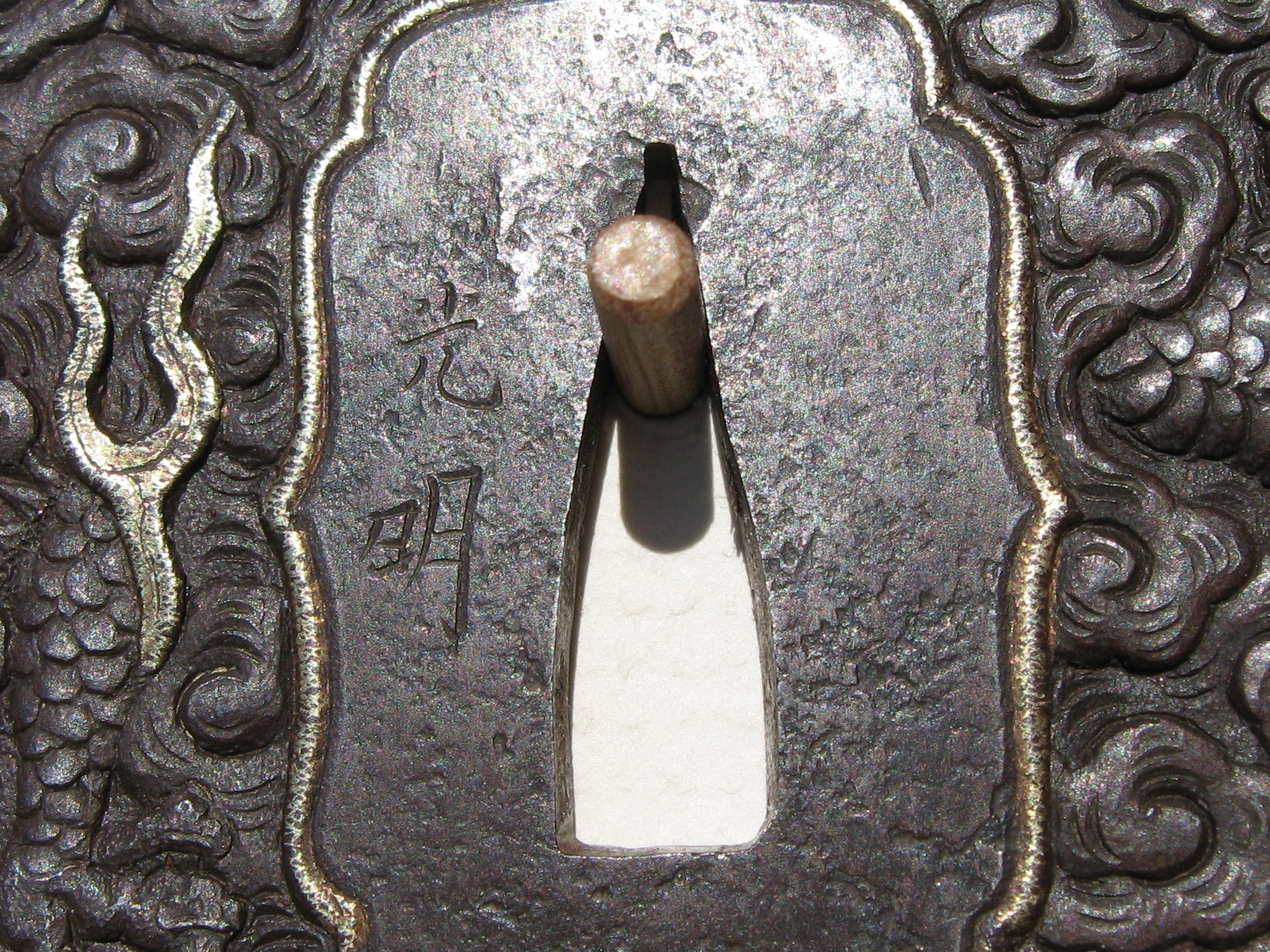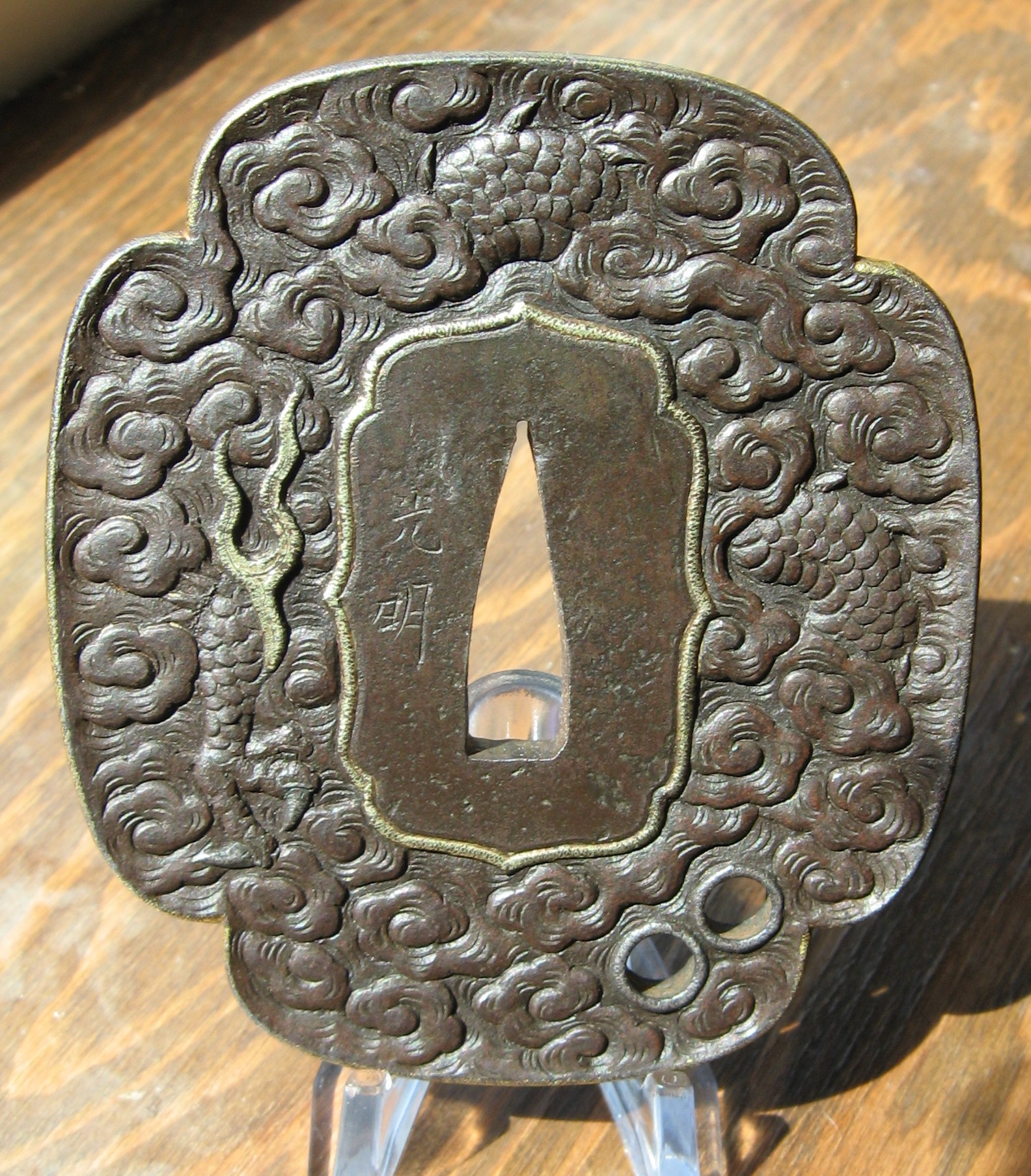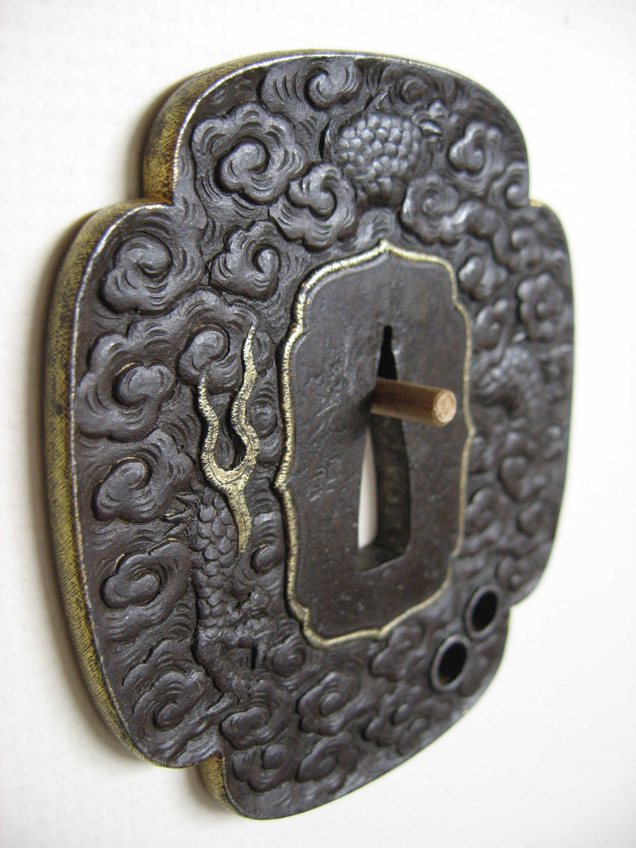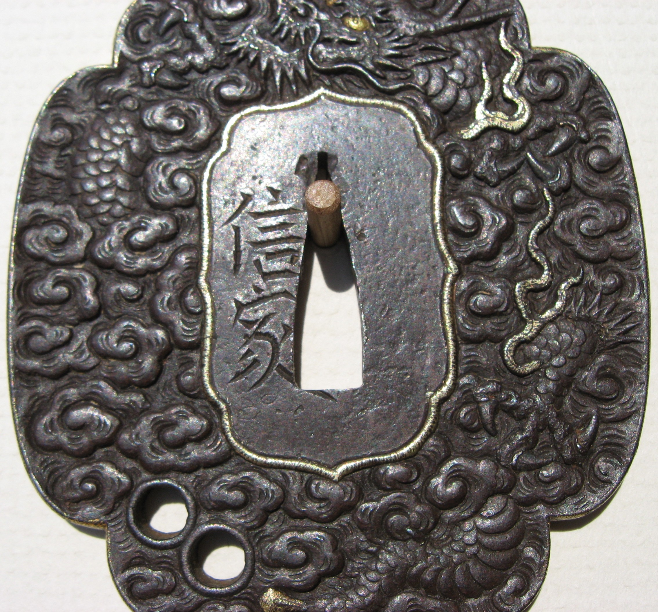 "Katana size iron mokko plate tsuba with the web carved in low relief of a male dragon in clouds. The head with gold eye, is at the top of the plate with a foot, one three toed leg and the tail at the bottom right of the plate, and two gold flames with a three toed foot between them. Also with udenuki-ana at the lower left of the face of the plate, and a gold ken in the tail. All gold in nunome." (Haynes & Long) 8.50cm x 7.50cm x 0.60cm |