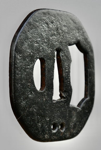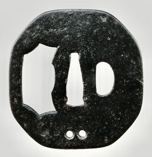 "2nd Sadahiro dates to ca 1600. Octagonal shape with iron ground, square edge. Design of the paper for the Japanese fan. Early Edo period. Sadahiro is a tsubasmith in Owari, and it is said that there are several generations. At that time, Yamayoshi, Hoan, and the famous Nobuiye were making tsuba in Kiyosu, Owari Province. There are some similarities in style with Yamayoshi and Hoan, which shows that they were making tsuba while interacting with each other at the same time. The active period of the first generation Yamayoshi and Hoan is almost clear, and we can imagine that they were producing tsuba from around the same time, around the Keicho era. In addition, Nobuiye, whose name is bold in his later years, made tsuba very similar to Sadahiro. This tsuba has an irregular octagonal shape with a slightly thinner structure from the face to the ears, allowing the base paper attached to the fan to be seen through. The style of deformed plate tsuba with watermarks is common to Yamayoshi's first generation. Although it is a simple shape, the flat ground has subtle variations with hammered marks and is grilled, giving it a mysterious atmosphere when combined with the soft shape. When you look at it, it creates a profound atmosphere that makes you feel as if you are having a Zen discussion with the author. Sadahiro is a forgotten figure, and his current reputation is not very high, but since a relatively large number of his works remain, at the time he was considered to be on a par with Nobuiye, Yamayoshi, and Hoyasu. It seems that he was a popular smith." (Haynes & Long) 78.5mm x 75.2mm x rim 4.4mm (face 4.5mm) |