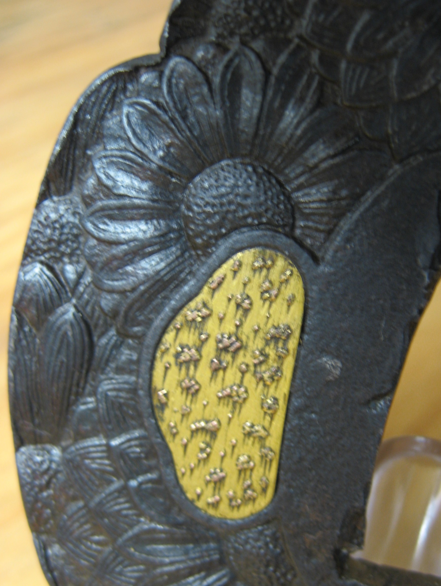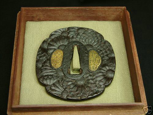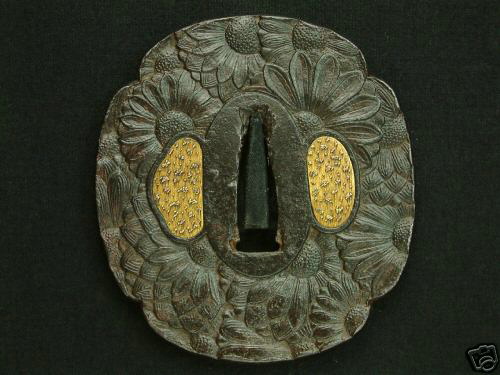 Iron plate with excellant patina of mokkogata shape with sukinokoshi mimi. Fine kiku (chrysanthemum) design occuring on both sides. Both hitsu-ana's covered with copper.