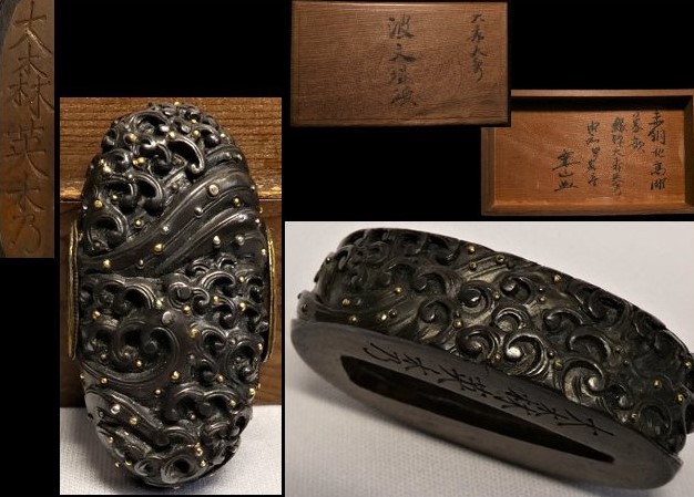 'GOTO JUNJO' and Kao $2000.00 "A very fine shakudo nanako base metal decorated with waves and rocks in shallow nikubori, shibuichi and gold zogan encased in gilt, some inlay missing. The waves are carved in the manner of the mainline Goto. Signed: 'GOTO JUNJO' (Mitsuaki) and Kao. H 02293.0. Junjo was the son of Beicho Seijo. Dates to mid Edo period." (Haynes) Dr. Torigoye Hakogake SARO + Kao, 1st Class Edo Period. |