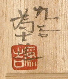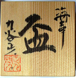 It may or may not have calligraphy on it, and sometimes it is stamped as opposed to being hand written. On a simple tomobako, there may be a simple explanation of what is inside like "Guinomi" - a sa'ke cup, and maybe a designation like "Kutani" and a stamped red seal (usually shop or distributer's marking). Sometimes a small printed paper that gives more information, in general, but not specific to the sa'ke cup, and no artist or kiln information. No nails are used and with simple tomobako, they are glued together. Rarely is there any marking inside the box. | |||